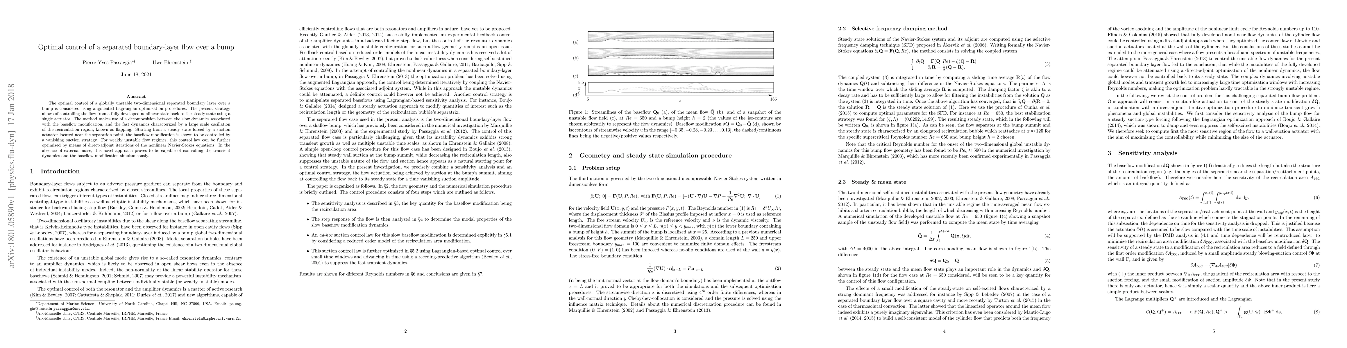This research applies augmented Lagrangian optimization to control a separated boundary-layer flow over a bump using a single actuator. It demonstrates that vanishing suction strategy can control baseflow modification, with further optimization possible for weakly unstable flows via Navier-Stokes equation iterations. The method successfully controls both transient dynamics and baseflow modification without external noise.