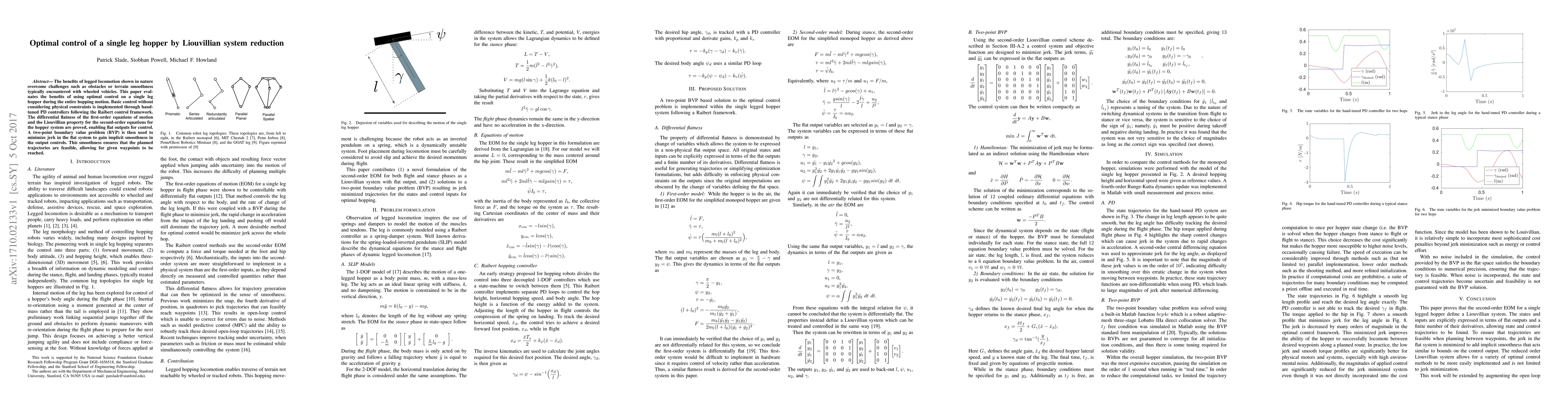 The benefits of legged locomotion shown in nature overcome challenges such as obstacles or terrain smoothness typically encountered with wheeled vehicles. This paper evaluates the benefits of using optimal control on a single leg hopper during the entire hopping motion. Basic control without considering physical constraints is implemented through hand-tuned PD controllers following the Raibert control framework. The differential flatness of the first-order equations of motion and the Liouvillian property for the second-order equations for the hopper system are proved, enabling flat outputs for control. A two-point boundary value problem (BVP) is then used to minimize jerk in the flat system to gain implicit smoothness in the output controls. This smoothness ensures that the planned trajectories are feasible, allowing for given waypoints to be reached.