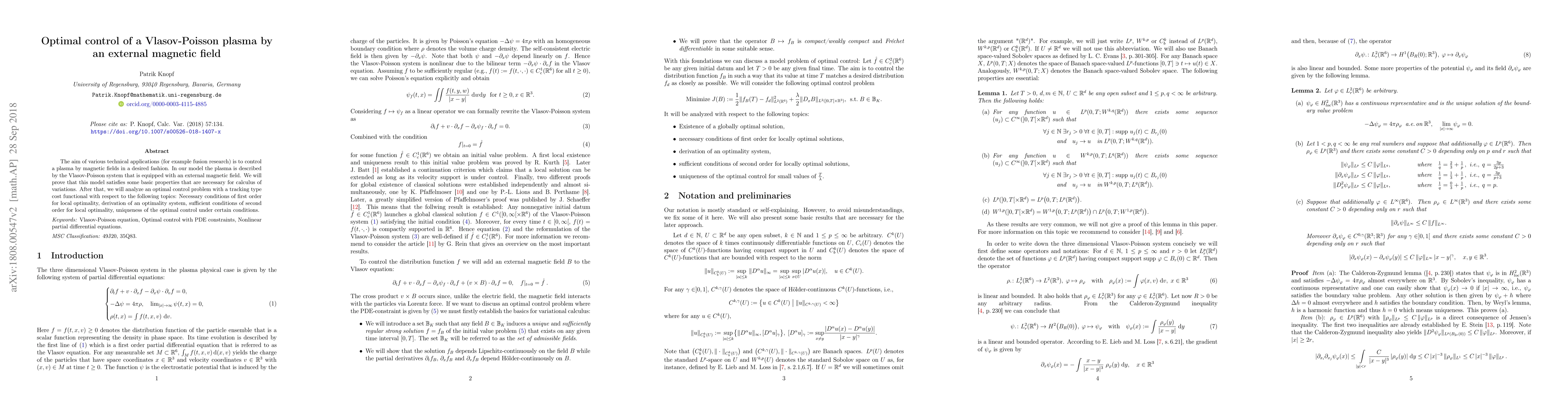 The aim of various technical applications (for example fusion research) is to control a plasma by magnetic fields in a desired fashion. In our model the plasma is described by the Vlasov-Poisson system that is equipped with an external magnetic field. We will prove that this model satisfies some basic properties that are necessary for calculus of variations. After that, we will analyze an optimal control problem with a tracking type cost functional with respect to the following topics: Necessary conditions of first order for local optimality, derivation of an optimality system, sufficient conditions of second order for local optimality, uniqueness of the optimal control under certain conditions.