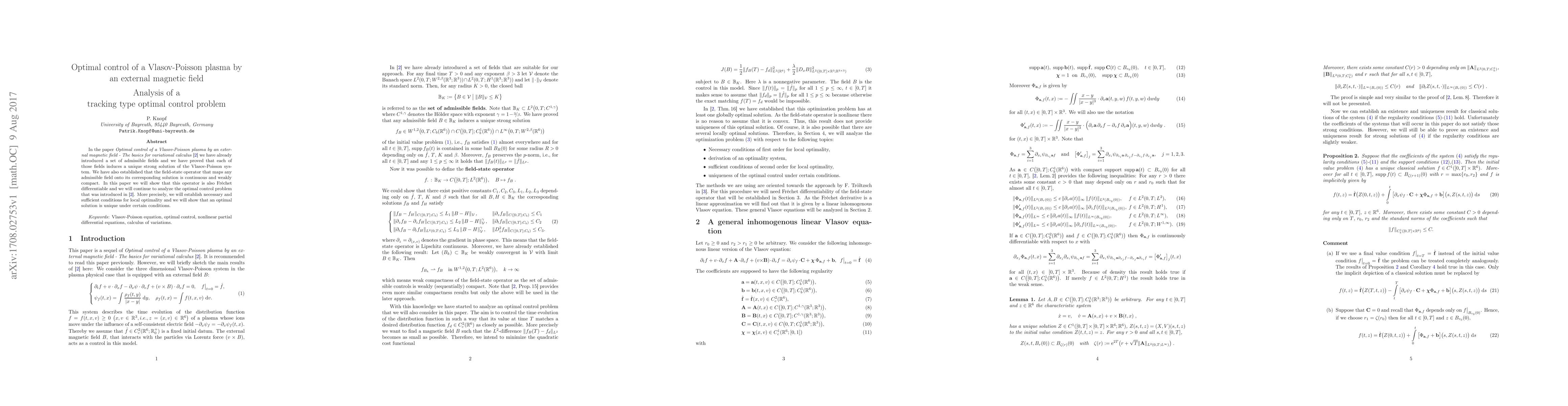 This paper investigates optimal control of a Vlasov-Poisson plasma using an external magnetic field, establishing necessary and sufficient conditions for local optimality and uniqueness under certain conditions.