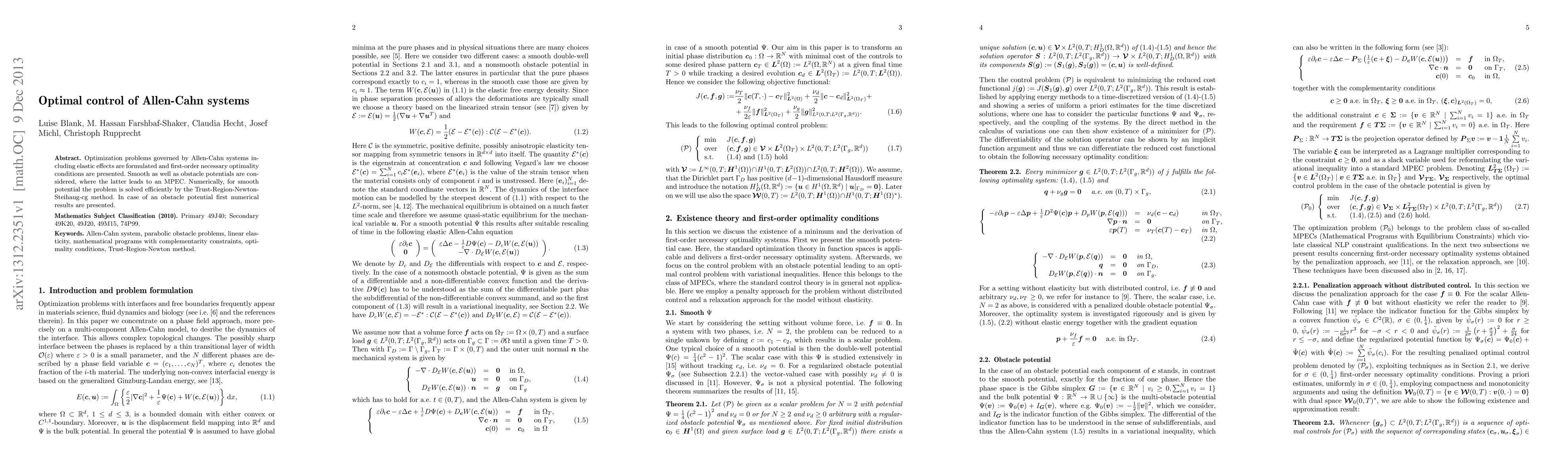 Optimization problems governed by Allen-Cahn systems including elastic effects are formulated and first-order necessary optimality conditions are presented. Smooth as well as obstacle potentials are considered, where the latter leads to an MPEC. Numerically, for smooth potential the problem is solved efficiently by the Trust-Region-Newton-Steihaug-cg method. In case of an obstacle potential first numerical results are presented.