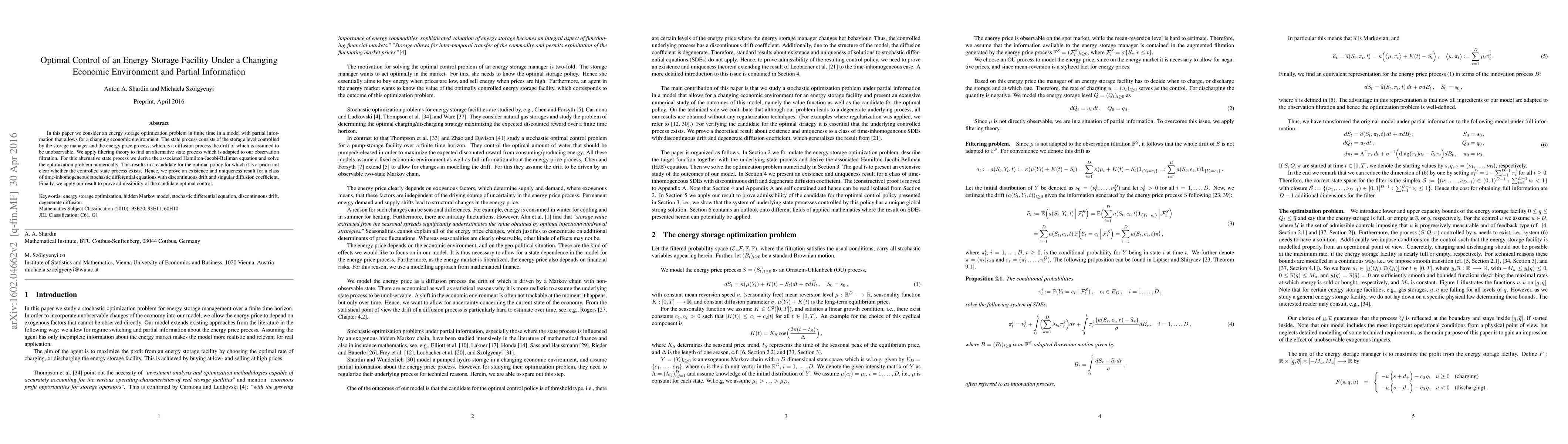 This paper develops an optimal control strategy for an energy storage facility under a fluctuating economic environment with partial information. It employs filtering theory to derive an alternative state process and solves the Hamilton-Jacobi-Bellman equation numerically, proving existence and uniqueness for the resulting stochastic differential equations and validating the candidate optimal control.