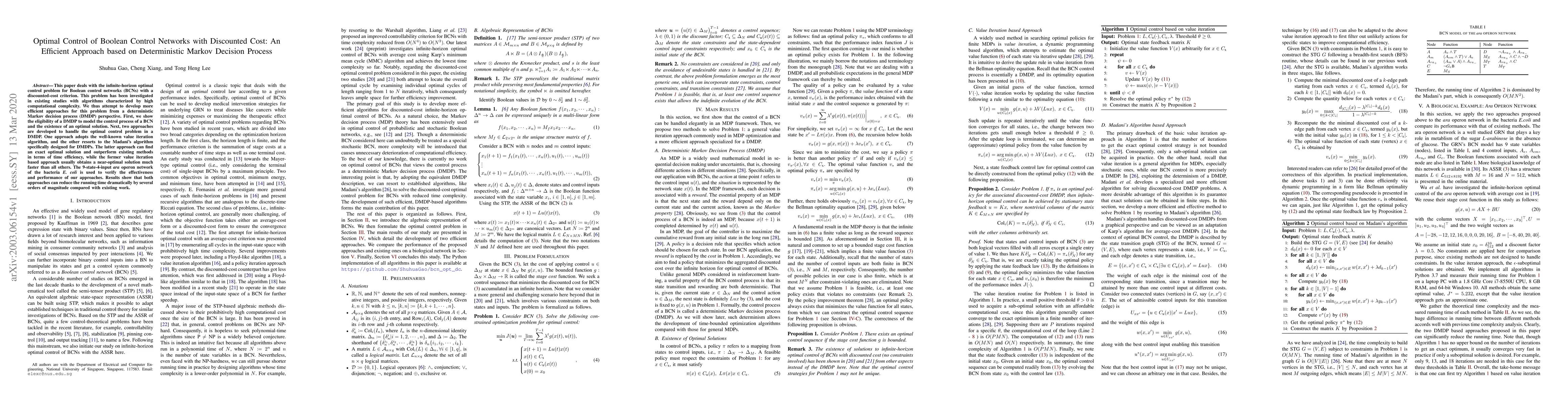 This paper proposes efficient methods for optimal control of Boolean control networks using a deterministic Markov decision process, demonstrating significant improvements in computational efficiency over existing high-complexity algorithms. Both value iteration and Madani's algorithm are evaluated, showing that the latter finds exact optimal solutions faster than the former.