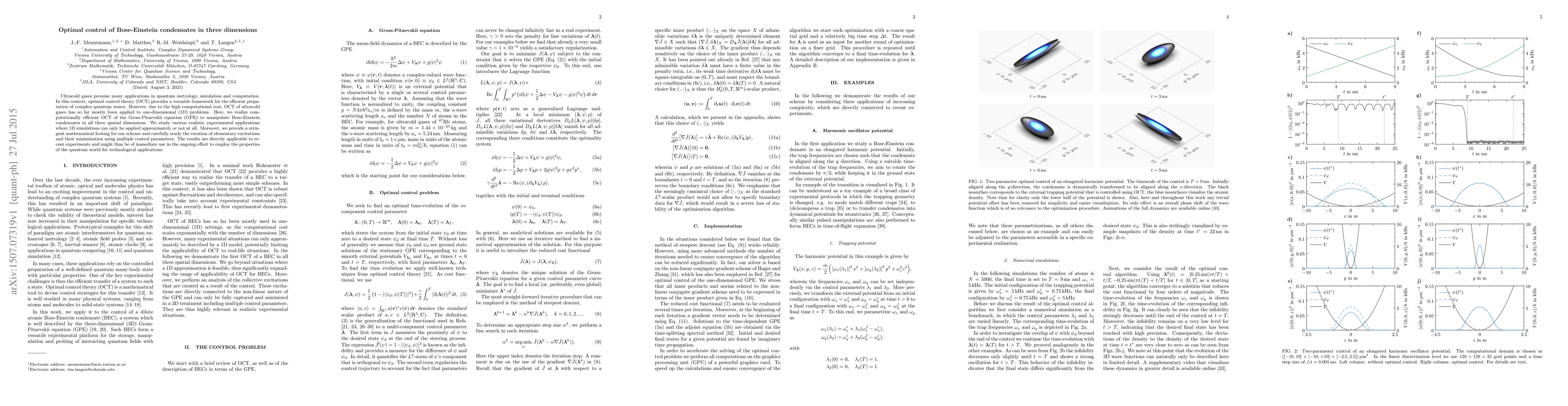 This paper presents a computationally efficient optimal control theory approach to manipulate Bose-Einstein condensates in three dimensions using the Gross-Pitaevskii equation, addressing limitations of one-dimensional simulations. The study provides a mathematical foundation and demonstrates practical applications for quantum technologies.