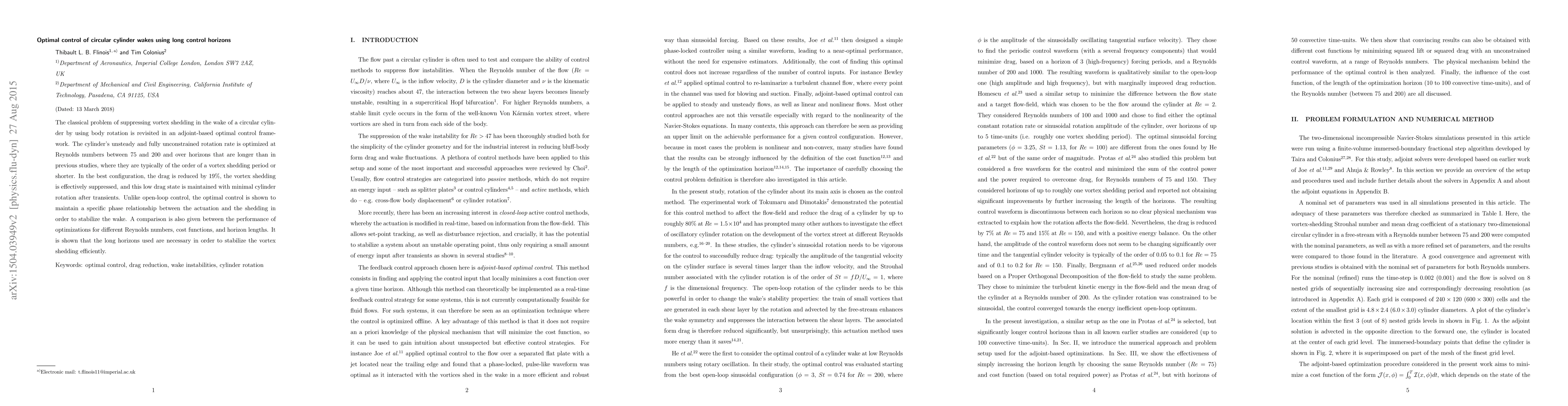 Researchers developed an optimal control framework to reduce drag and suppress vortex shedding in a circular cylinder wake using long control horizons. The method successfully reduced drag by 19% and maintained stable wakes with minimal rotation after transients.