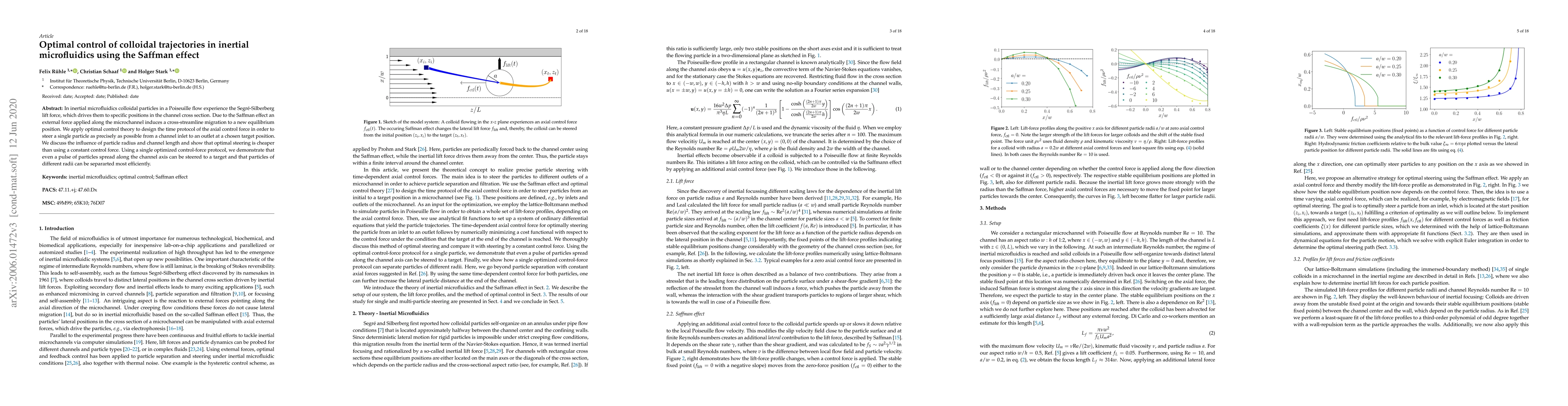 This paper employs optimal control theory to design an effective time protocol for the axial control force in inertial microfluidics, leveraging the Saffman effect for precise steering of colloidal particles. The study shows that optimal control is more efficient than constant force, enabling precise targeting and separation of particles of different radii.