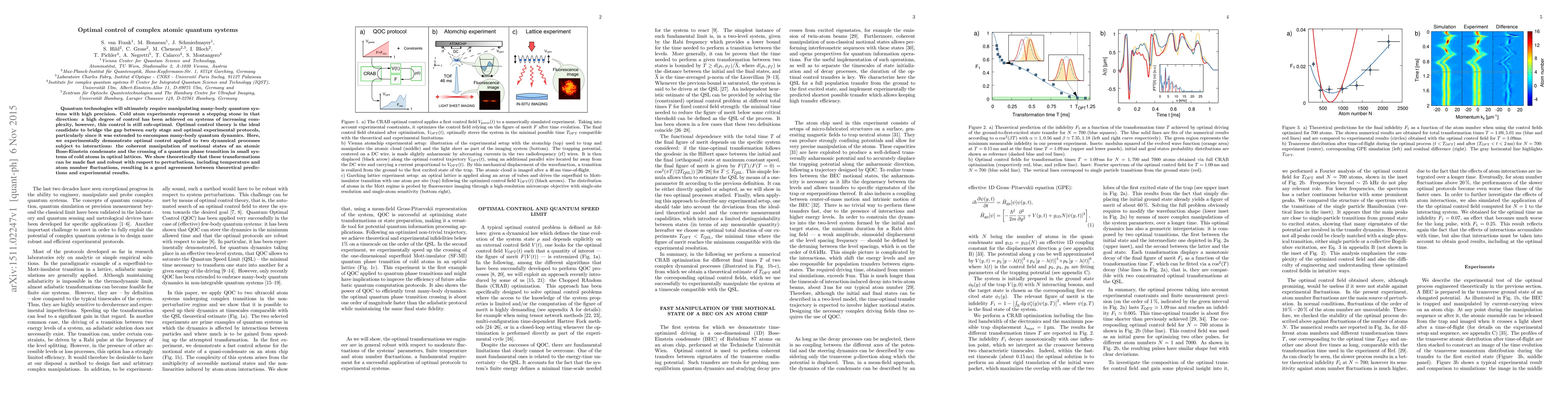 This paper demonstrates optimal control theory applied to complex atomic quantum systems, achieving precise manipulation of motional states in Bose-Einstein condensates and crossing quantum phase transitions in cold atom systems. Theoretical predictions show these processes can be made fast and robust, aligning well with experimental results.