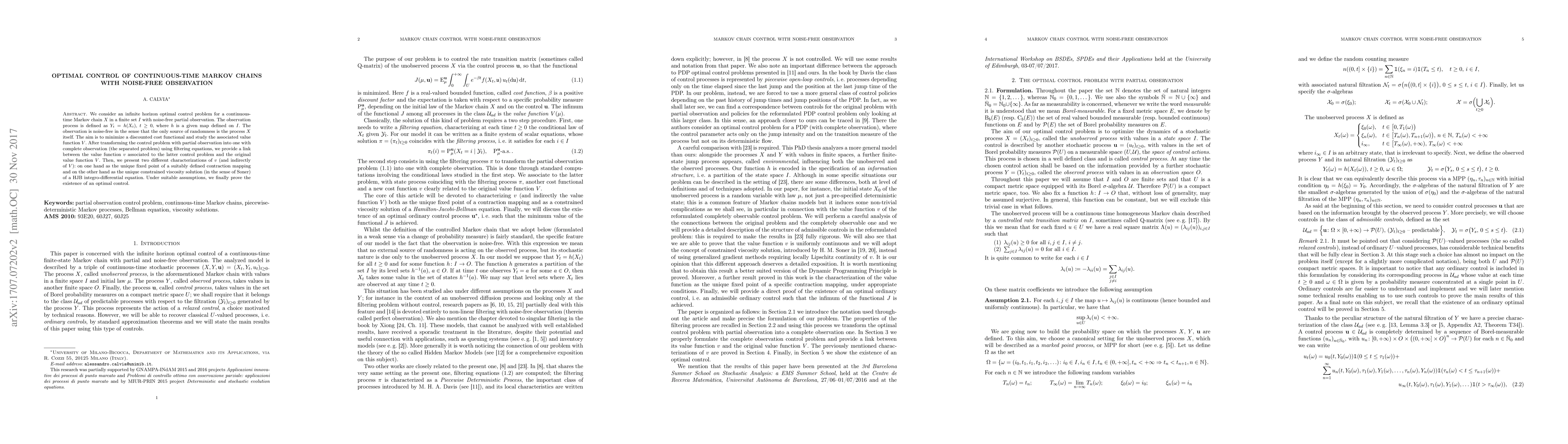 This paper solves an optimal control problem for a continuous-time Markov chain with partial observation, showing two characterizations of the value function: as a fixed point of a contraction mapping and as the solution to a HJB integro-differential equation.