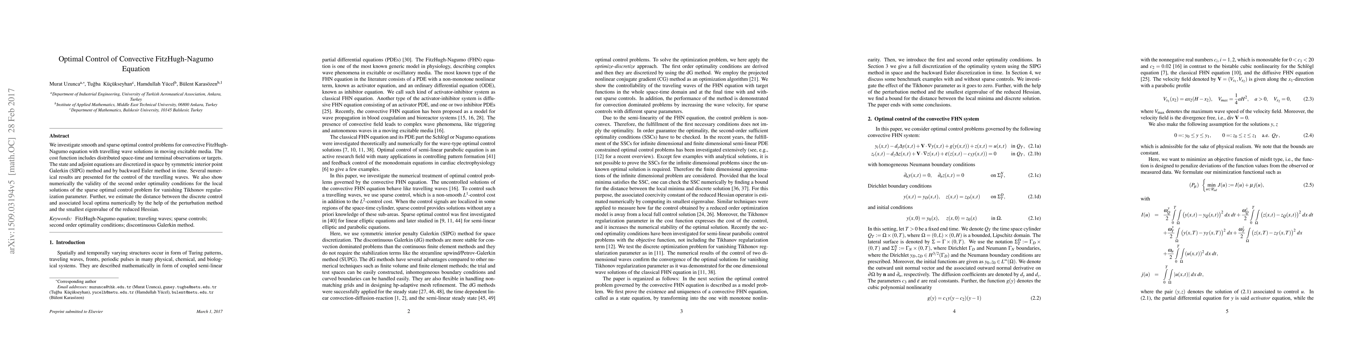 This paper explores optimal control strategies for the convective FitzHugh-Nagumo equation, focusing on smooth and sparse controls for travelling wave solutions. It employs the SIPG method for spatial discretization and backward Euler for time, presenting numerical results and validating second-order optimality conditions for sparse controls.