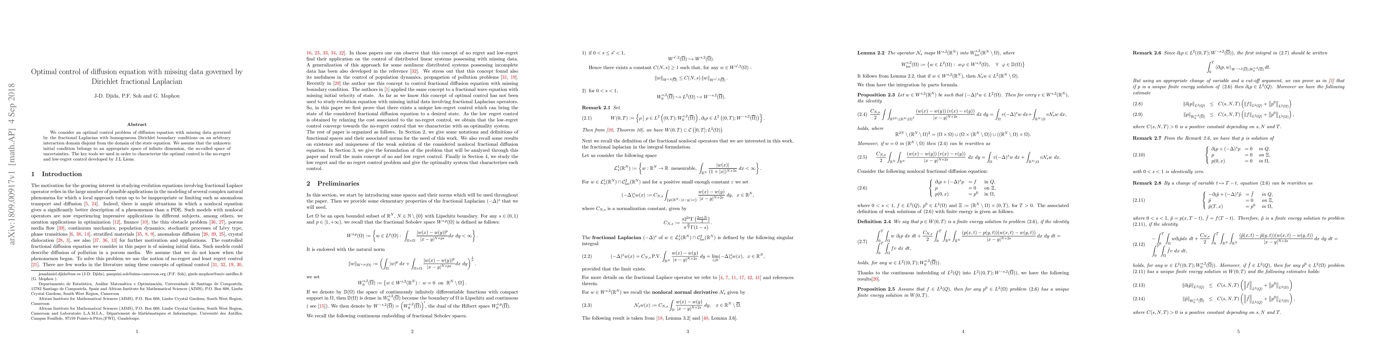 This paper addresses an optimal control problem for a diffusion equation with missing data, governed by a fractional Laplacian with Dirichlet boundary conditions. The authors utilize J.L Lions' no-regret and low-regret control theory to characterize the optimal control, considering uncertainties in the initial condition.