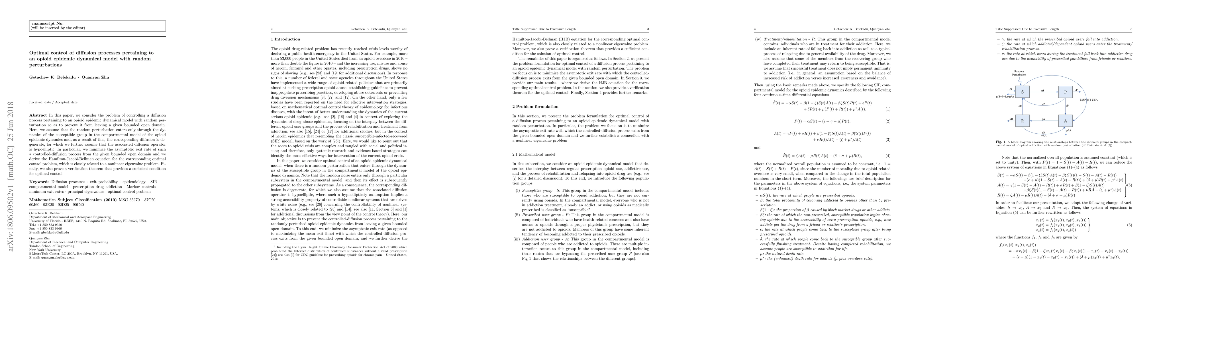 This paper develops an optimal control strategy for a diffusion process modeling the opioid epidemic, incorporating random perturbations affecting the susceptible group. The authors derive a Hamilton-Jacobi-Bellman equation and prove a verification theorem to ensure the control minimizes the exit rate from a bounded domain.