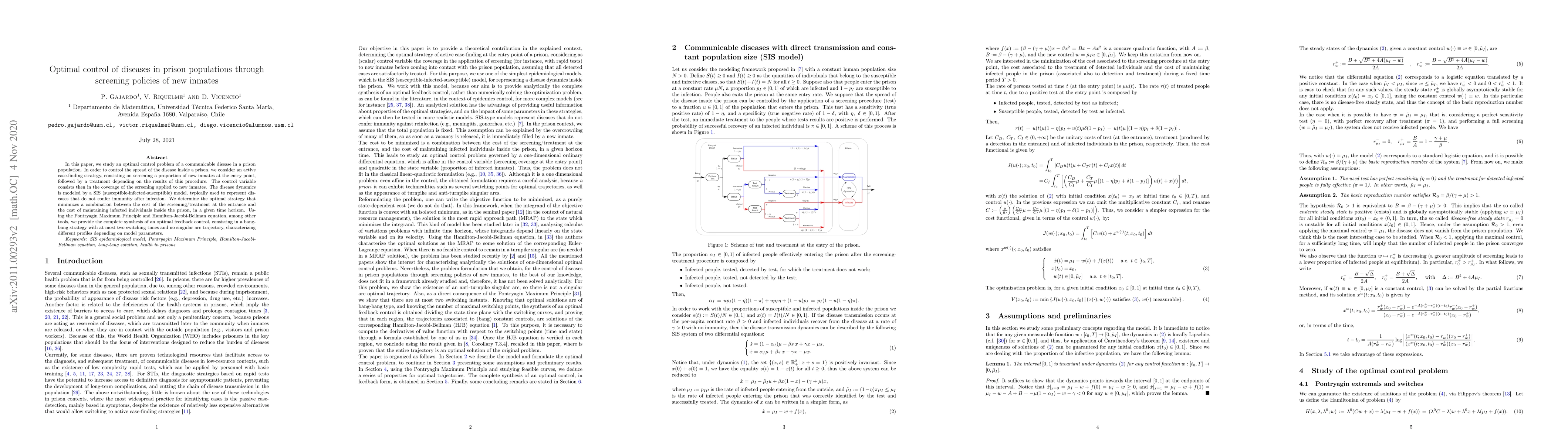 In this paper, we study an optimal control problem of a communicable disease in a prison population. In order to control the spread of the disease inside a prison, we consider an active case-finding strategy, consisting on screening a proportion of new inmates at the entry point, followed by a treatment depending on the results of this procedure. The control variable consists then in the coverage of the screening applied to new inmates. The disease dynamics is modeled by a SIS (susceptible-infected-susceptible) model, typically used to represent diseases that do not confer immunity after infection. We determine the optimal strategy that minimizes a combination between the cost of the screening/treatment at the entrance and the cost of maintaining infected individuals inside the prison, in a given time horizon. Using the Pontryagin Maximum Principle and Hamilton-Jacobi-Bellman equation, among other tools, we provide the complete synthesis of an optimal feedback control, consisting in a bang-bang strategy with at most two switching times and no singular arc trajectory, characterizing different profiles depending on model parameters.