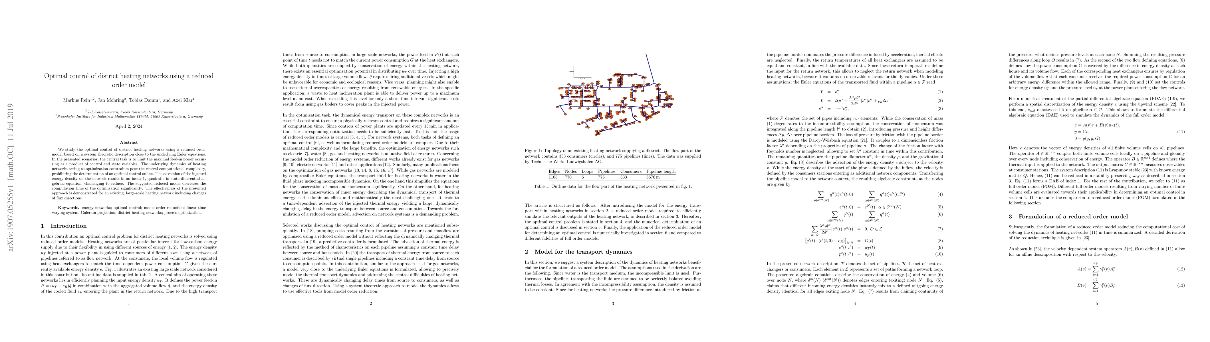 We study the optimal control of district heating networks using a reduced order model based on a system theoretic description close to the underlying Euler equations. In the presented scenarios, the central task is to limit the maximal feed-in power occurring as a product of control and state variables. The underlying dynamics of heating networks acting as optimization constraints pose the central computational complexity, prohibiting the determination of an optimal control online. The advection of the injected energy density on the network results in an index-1, quadratic in state differential algebraic equation, challenging to reduce. The suggested reduced model decreases the computation time of the optimization significantly. The effectiveness of the presented approach is demonstrated for an existing, large-scale heating network including changes of flux directions.