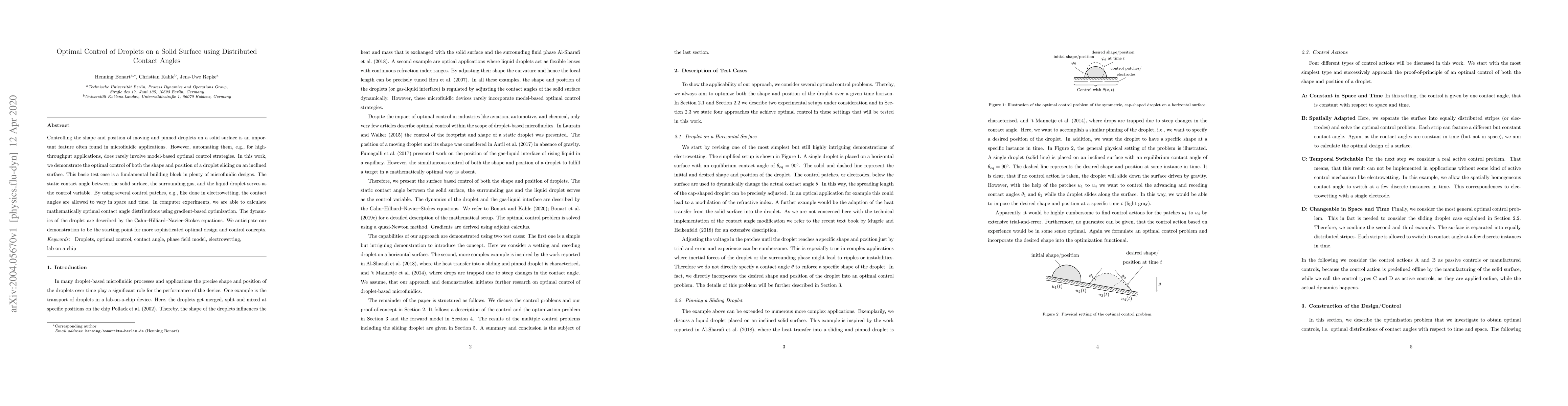 Controlling the shape and position of moving and pinned droplets on a solid surface is an important feature often found in microfluidic applications. However, automating them, e.g., for high-throughput applications, does rarely involve model-based optimal control strategies. In this work, we demonstrate the optimal control of both the shape and position of a droplet sliding on an inclined surface. This basic test case is a fundamental building block in plenty of microfluidic designs. The static contact angle between the solid surface, the surrounding gas, and the liquid droplet serves as the control variable. By using several control patches, e.g., like done in electrowetting, the contact angles are allowed to vary in space and time. In computer experiments, we are able to calculate mathematically optimal contact angle distributions using gradient-based optimization. The dynamics of the droplet are described by the Cahn-Hilliard-Navier-Stokes equations. We anticipate our demonstration to be the starting point for more sophisticated optimal design and control concepts.
