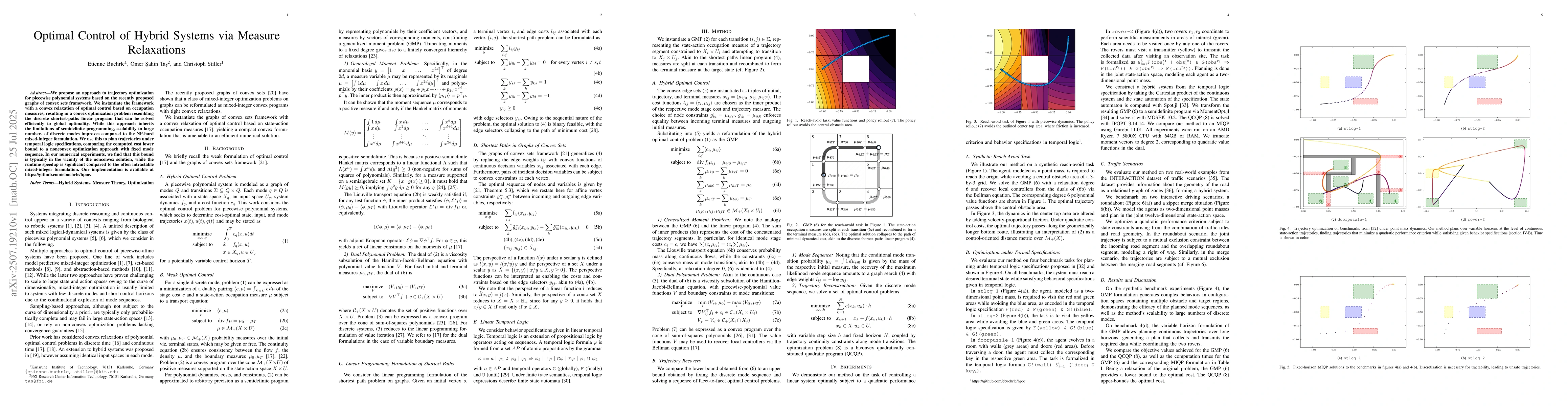 We propose an approach to trajectory optimization for piecewise polynomial systems based on the recently proposed graphs of convex sets framework. We instantiate the framework with a convex relaxation of optimal control based on occupation measures, resulting in a convex optimization problem resembling the discrete shortest-paths linear program that can be solved efficiently to global optimality. While this approach inherits the limitations of semidefinite programming, scalability to large numbers of discrete modes improves compared to the NP-hard mixed-integer formulation. We use this to plan trajectories under temporal logic specifications, comparing the computed cost lower bound to a nonconvex optimization approach with fixed mode sequence. In our numerical experiments, we find that this bound is typically in the vicinity of the nonconvex solution, while the runtime speedup is significant compared to the often intractable mixed-integer formulation. Our implementation is available at https://github.com/ebuehrle/hpoc.