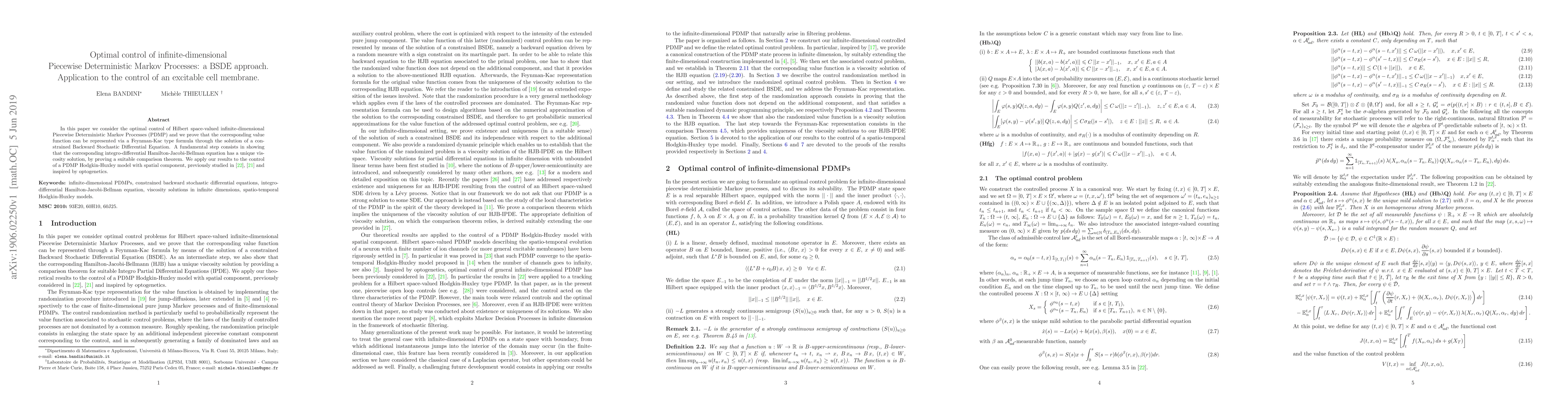 This paper develops an optimal control framework for infinite-dimensional Piecewise Deterministic Markov Processes (PDMP) using a BSDE approach, proving a Feynman-Kac formula for the value function. It applies these methods to control a PDMP model of an excitable cell membrane inspired by optogenetics.