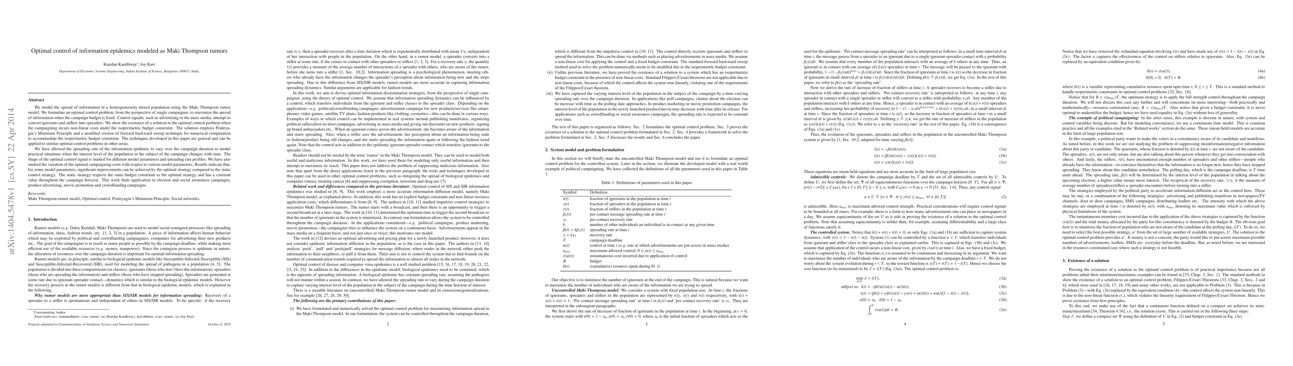This paper models information spread as an epidemic using the Maki Thompson rumor model and formulates an optimal control problem to maximize information dissemination with a fixed budget. It employs Pontryagin's Minimum Principle and a forward-backward sweep technique to find optimal control signals that convert ignorants and stiflers into spreaders, demonstrating significant improvements over static strategies.