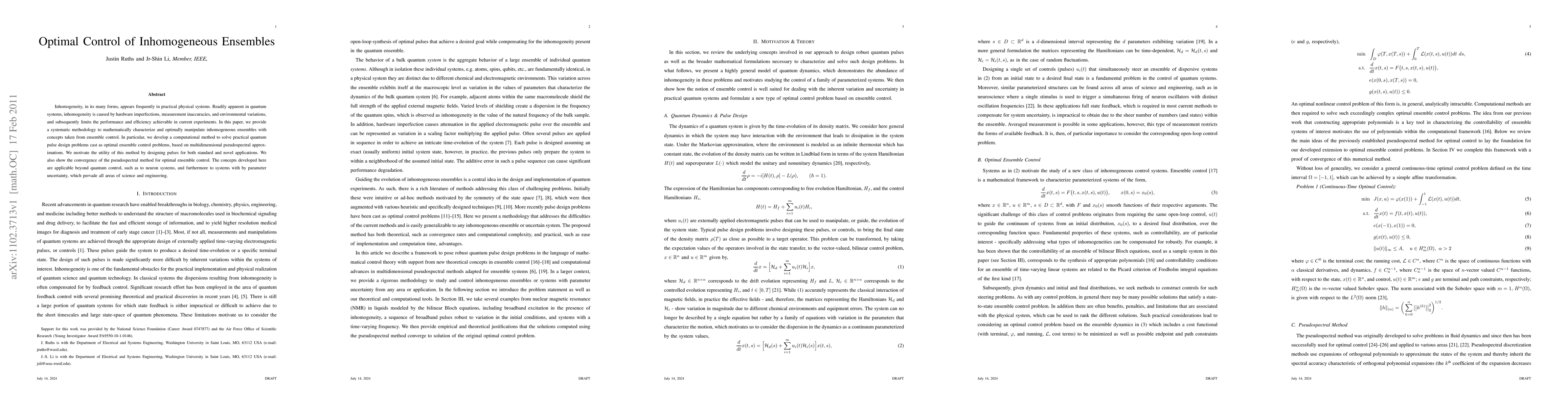 This paper presents a systematic methodology for mathematically characterizing and optimally manipulating inhomogeneous ensembles, particularly in quantum systems, using ensemble control concepts. The authors develop a computational method based on multidimensional pseudospectral approximations to solve quantum pulse design problems, demonstrating its utility through practical applications and showing its convergence.