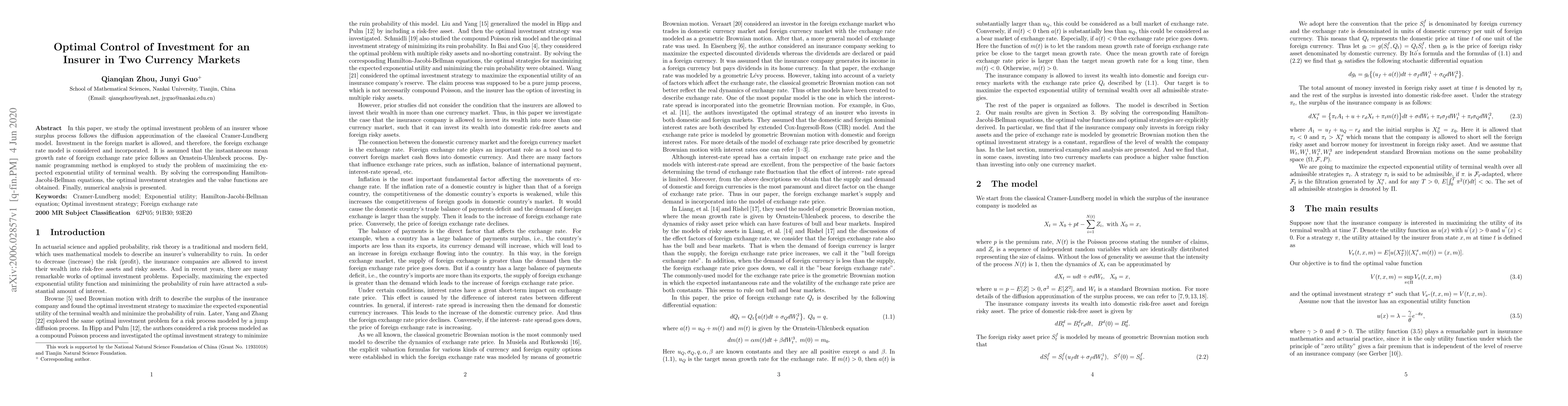 In this paper, we study the optimal investment problem of an insurer whose surplus process follows the diffusion approximation of the classical Cramer-Lundberg model. Investment in the foreign market is allowed, and therefore, the foreign exchange rate model is considered and incorporated. It is assumed that the instantaneous mean growth rate of foreign exchange rate price follows an Ornstein-Uhlenbeck process. Dynamic programming method is employed to study the problem of maximizing the expected exponential utility of terminal wealth. By soloving the correspoding Hamilton-Jacobi-Bellman equations, the optimal investment strategies and the value functions are obtained. Finally, numerical analysis is presented.