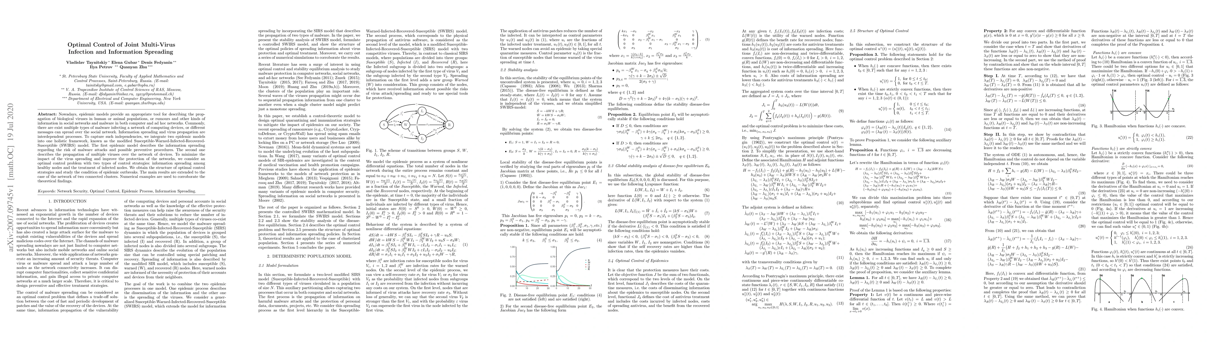Nowadays, epidemic models provide an appropriate tool for describing the propagation of biological viruses in human or animal populations, or rumours and other kinds of information in social networks and malware in both computer and ad hoc networks. Commonly, there are exist multiple types of malware infecting a network of computing devices, or different messages can spread over the social network. Information spreading and virus propagation are interdependent processes. To capture such independencies, we integrate two epidemic models into one holistic framework, known as the modified Susceptible-Warned-Infected-Recovered-Susceptible (SWIRS) model. The first epidemic model describes the information spreading regarding the risk of malware attacks and possible preventive procedures. The second one describes the propagation of multiple viruses over the network of devices. To minimize the impact of the virus spreading and improve the protection of the networks, we consider an optimal control problem with two types of control strategies: information spreading among healthy nodes and the treatment of infected nodes. We obtain the structure of optimal control strategies and study the condition of epidemic outbreaks. The main results are extended to the case of the network of two connected clusters. Numerical examples are used to corroborate the theoretical findings.