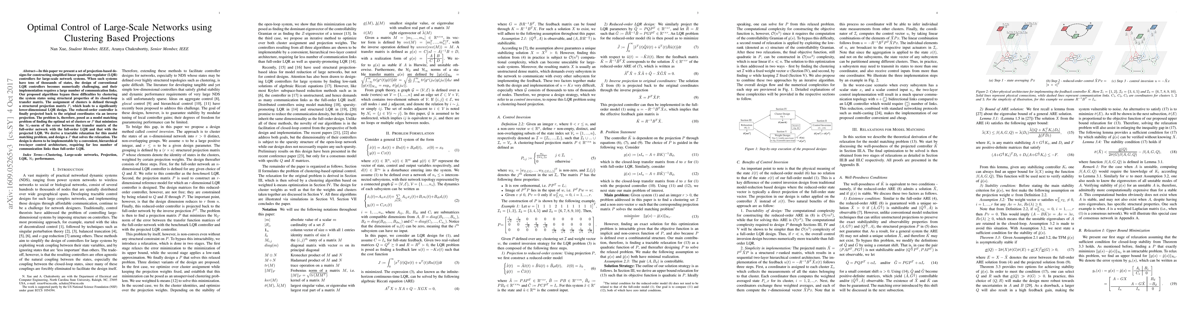 In this paper we present a set of projection-based designs for constructing simplified linear quadratic regulator (LQR) controllers for large-scale network systems. When such systems have tens of thousands of states, the design of conventional LQR controllers becomes numerically challenging, and their implementation requires a large number of communication links. Our proposed algorithms bypass these difficulties by clustering the system states using structural properties of its closed-loop transfer matrix. The assignment of clusters is defined through a structured projection matrix P, which leads to a significantly lower-dimensional LQR design. The reduced-order controller is finally projected back to the original coordinates via an inverse projection. The problem is, therefore, posed as a model matching problem of finding the optimal set of clusters or P that minimizes the H2-norm of the error between the transfer matrix of the full-order network with the full-order LQR and that with the projected LQR. We derive a tractable relaxation for this model matching problem, and design a P that solves the relaxation. The design is shown to be implementable by a convenient, hierarchical two-layer control architecture, requiring far less number of communication links than full-order LQR.