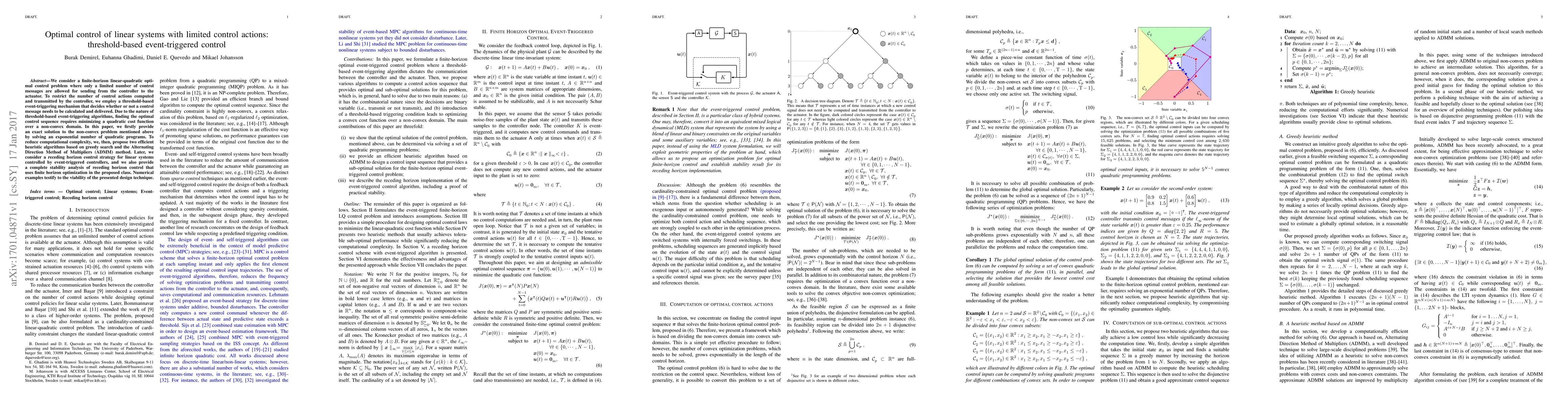 This paper explores optimal control for linear systems under limited control actions using a threshold-based event-triggered control mechanism. It provides an exact solution to the non-convex optimization problem and proposes heuristic algorithms to reduce computational complexity, followed by a stability analysis for a receding horizon control strategy.