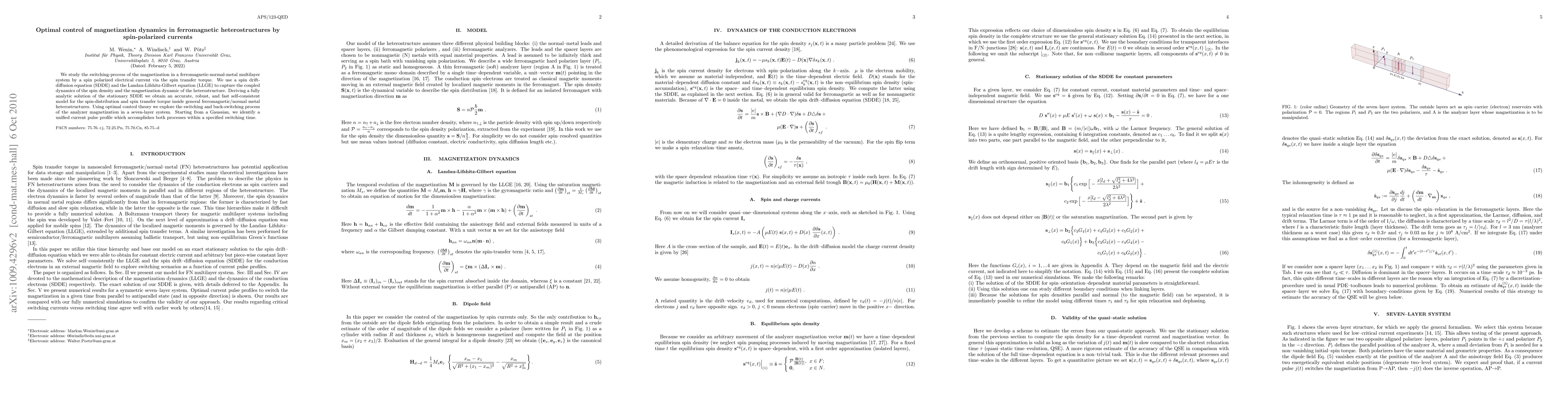 This paper develops an analytic model for the magnetization dynamics in ferromagnetic heterostructures driven by spin-polarized currents, employing the spin drift-diffusion and Landau-Lifshitz-Gilbert equations. It uses optimal control theory to find a current pulse profile that efficiently switches and back-switches magnetization within a given time frame.