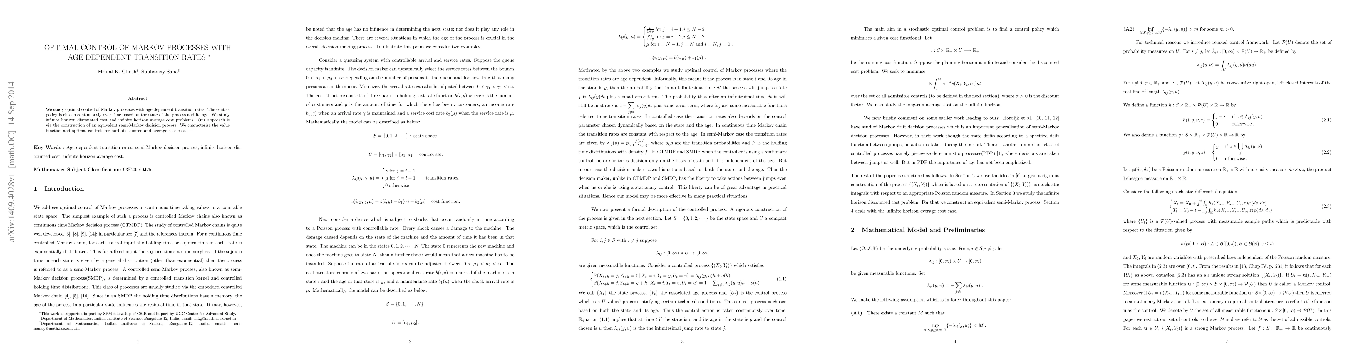 This paper investigates optimal control strategies for Markov processes with age-dependent transition rates, employing an equivalent semi-Markov decision process to characterize value functions and optimal controls for both discounted and average cost scenarios.
