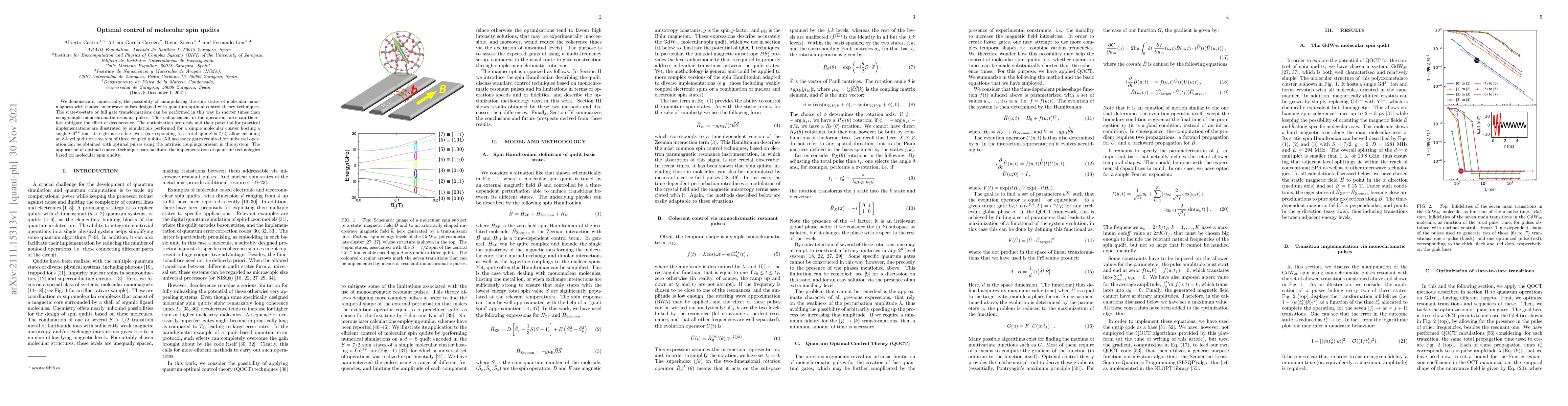This paper demonstrates the use of quantum optimal control theory to manipulate the spin states of molecular nanomagnets with shaped microwave pulses, achieving faster state transformations and mitigating decoherence compared to traditional methods. Simulations on a Gd$^{3+}$ ion in a molecular cluster show the feasibility of implementing universal quantum gates using intrinsic system couplings.