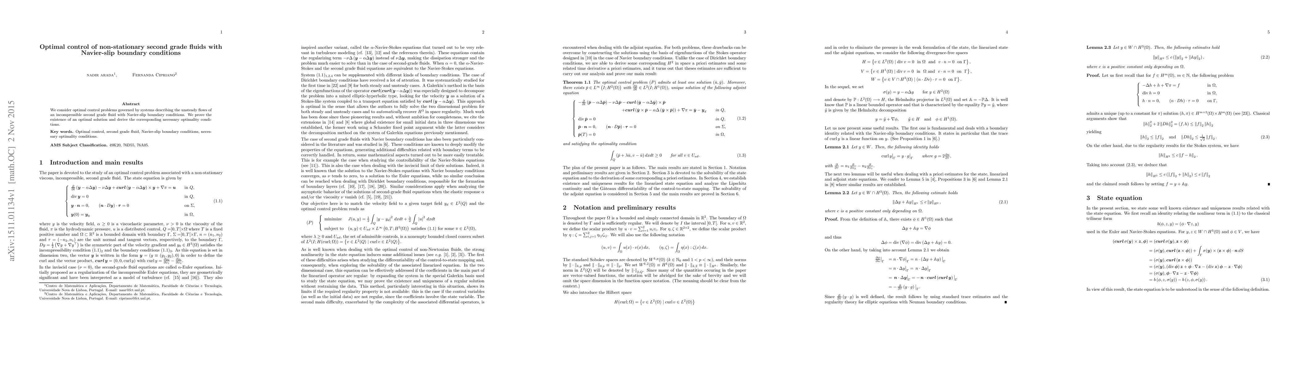 This paper investigates optimal control for unsteady flows of incompressible second grade fluids, focusing on systems with Navier-slip boundary conditions. The authors prove the existence of an optimal solution and establish the necessary conditions for optimality.