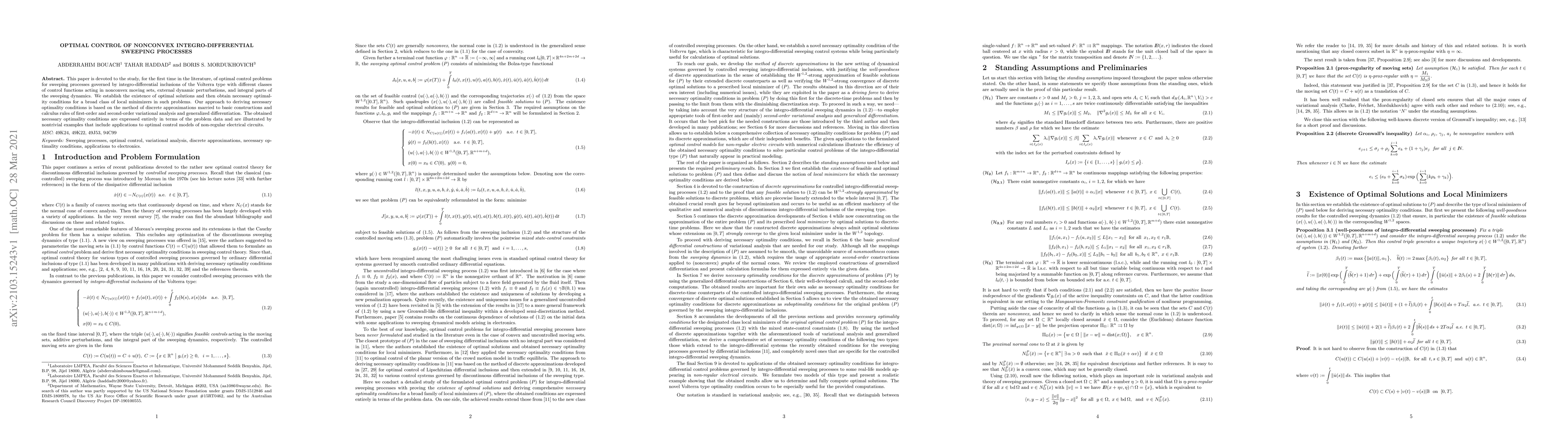 This paper is devoted to the study, for the first time in the literature, of optimal control problems for sweeping processes governed by integro-differential inclusions of the Volterra type with different classes of control functions acting in nonconvex moving sets, external dynamic perturbations, and integral parts of the sweeping dynamics. We establish the existence of optimal solutions and then obtain necessary optimality conditions for a broad class of local minimizers in such problems. Our approach to deriving necessary optimality conditions is based on the method of discrete approximations married to basic constructions and calculus rules of first-order and second-order variational analysis and generalized differentiation. The obtained necessary optimality conditions are expressed entirely in terms of the problem data and are illustrated by nontrivial examples that include applications to optimal control models of non-regular electrical circuits.