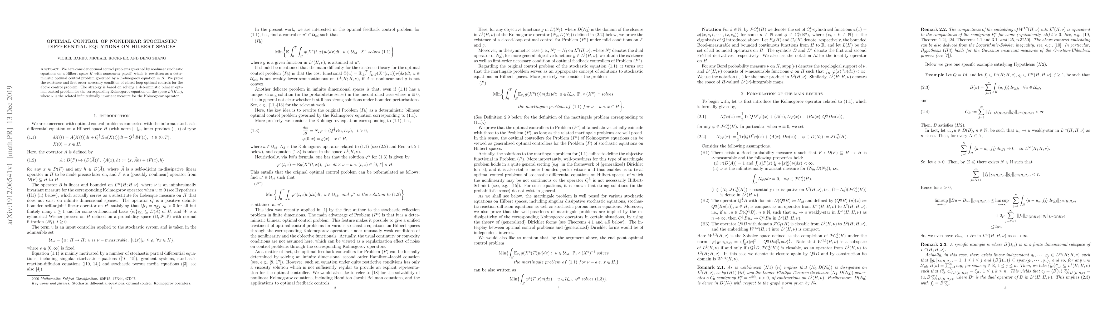 This paper investigates optimal control of nonlinear stochastic differential equations on Hilbert spaces, transforming the problem into a deterministic optimal control issue governed by a Kolmogorov equation. The authors prove the existence of closed-loop optimal controls and establish the first-order necessary conditions for this transformed problem.