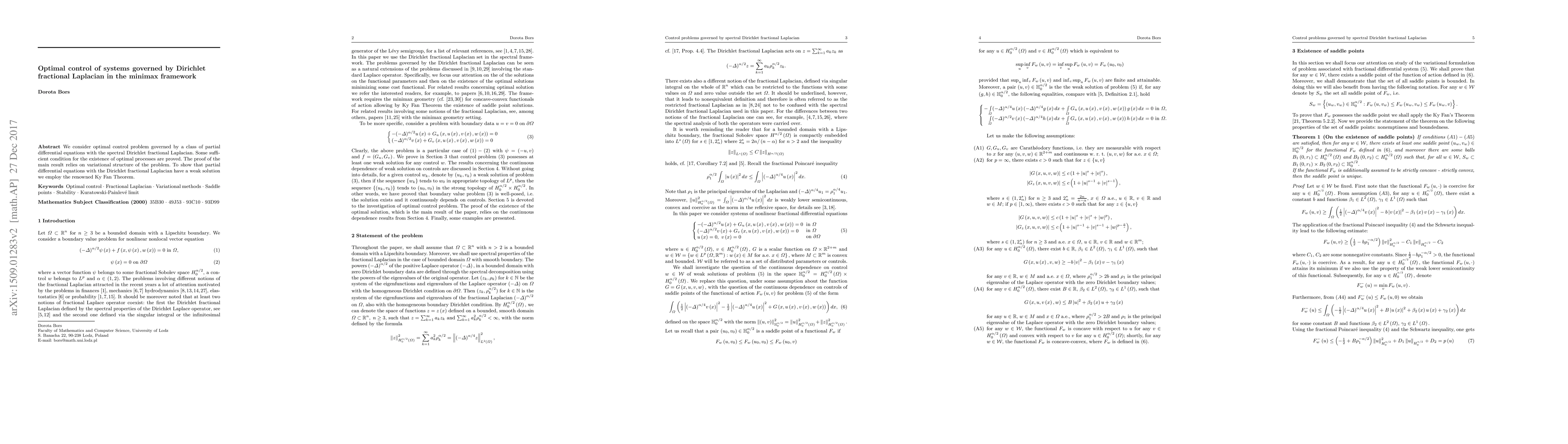 We consider an optimal control problem governed by a class of boundary value problem with the spectral Dirichlet fractional Laplacian. Some sufficient condition for the existence of optimal processes is stated. The proof of the main result relies on variational structure of the problem. To show that boundary value problem with the Dirichlet fractional Laplacian has a weak solution we employ the renowned Ky Fan Theorem.