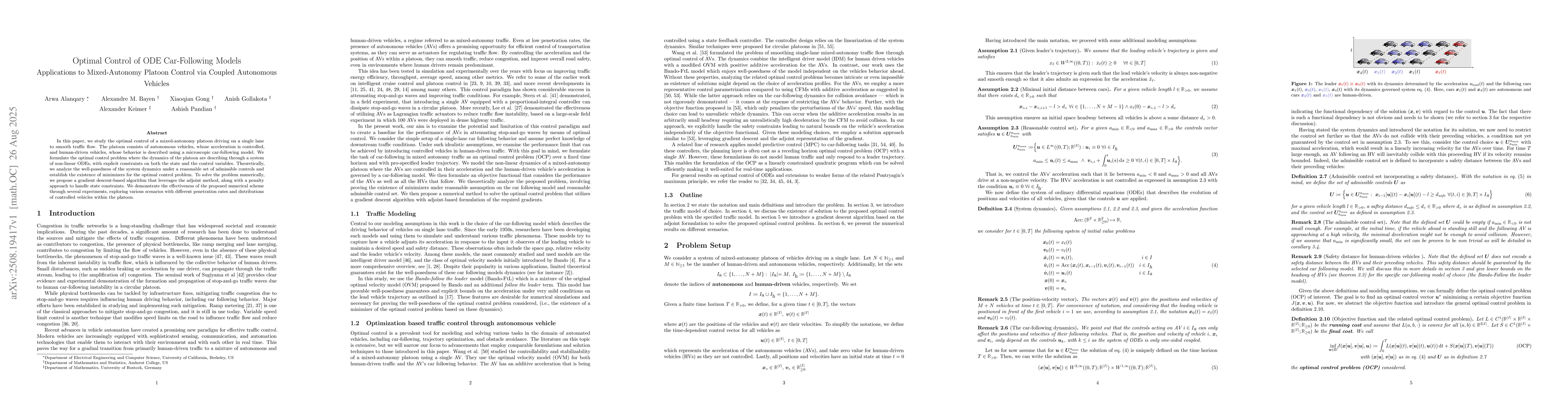 In this paper, we study the optimal control of a mixed-autonomy platoon driving on a single lane to smooth traffic flow. The platoon consists of autonomous vehicles, whose acceleration is controlled, and human-driven vehicles, whose behavior is described using a microscopic car-following model. We formulate the optimal control problem where the dynamics of the platoon are describing through a system of non-linear ODEs, with explicit constraints on both the state and the control variables. Theoretically, we analyze the well-posedness of the system dynamics under a reasonable set of admissible controls and establish the existence of minimizers for the optimal control problem. To solve the problem numerically, we propose a gradient descent-based algorithm that leverages the adjoint method, along with a penalty approach to handle state constraints. We demonstrate the effectiveness of the proposed numerical scheme through several experiments, exploring various scenarios with different penetration rates and distributions of controlled vehicles within the platoon.