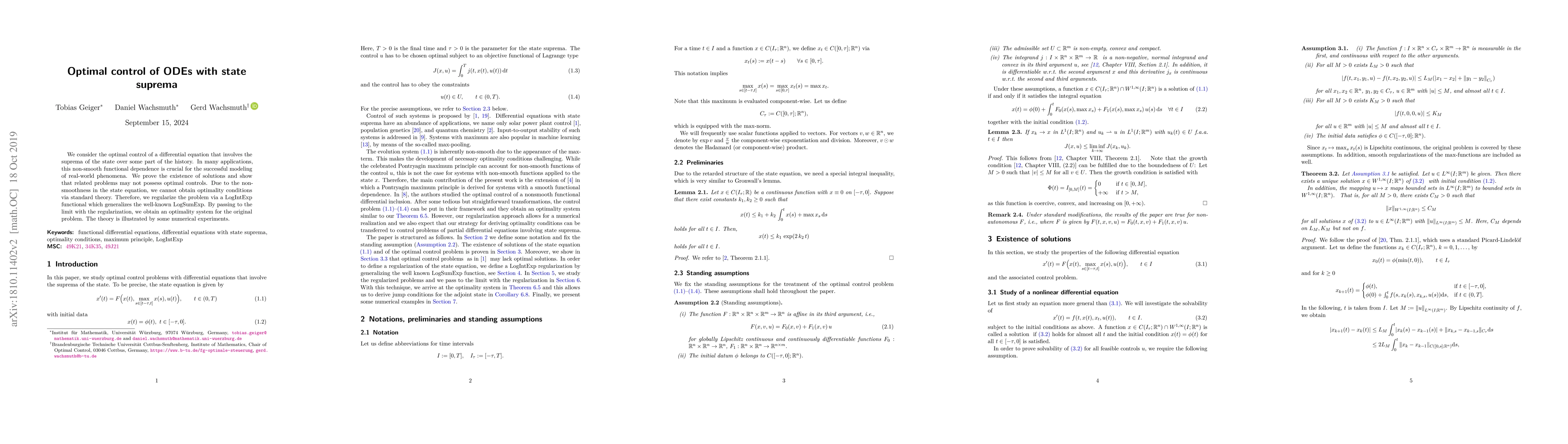 We consider the optimal control of a differential equation that involves the suprema of the state over some part of the history. In many applications, this non-smooth functional dependence is crucial for the successful modeling of real-world phenomena. We prove the existence of solutions and show that related problems may not possess optimal controls. Due to the non-smoothness in the state equation, we cannot obtain optimality conditions via standard theory. Therefore, we regularize the problem via a novel LogIntExp functional which generalizes the well-known LogSumExp. By passing to the limit with the regularization, we obtain an optimality system for the original problem. The theory is illustrated by some numerical experiments.