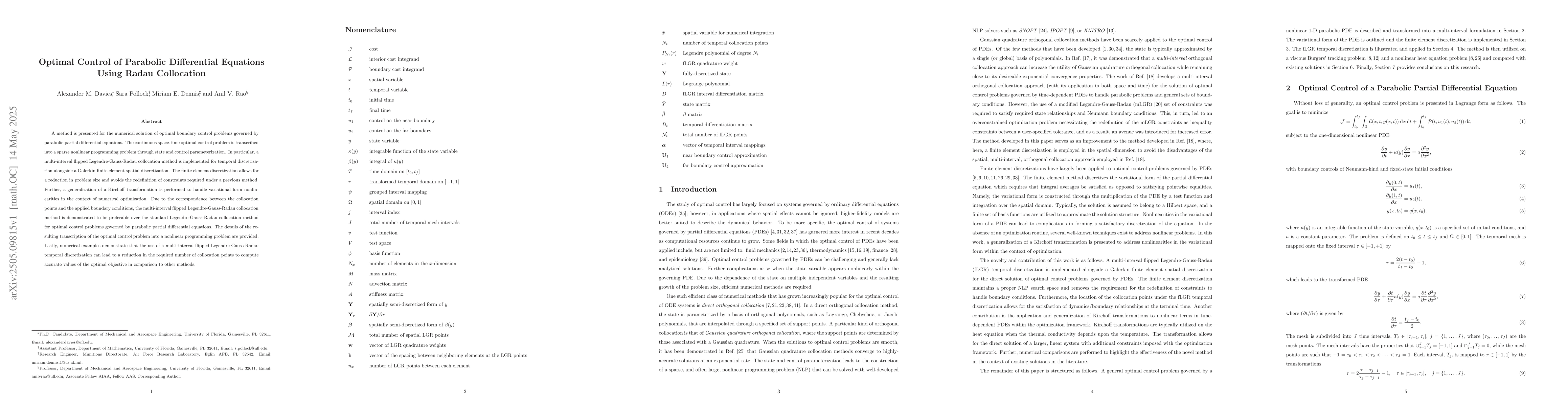 The research presents a method for solving optimal boundary control problems governed by parabolic PDEs. It transcribes the continuous space-time optimal control problem into a sparse nonlinear programming problem using state and control parameterization. The method employs a multi-interval flipped Legendre-Gauss-Radau collocation for temporal discretization and Galerkin finite element spatial discretization.