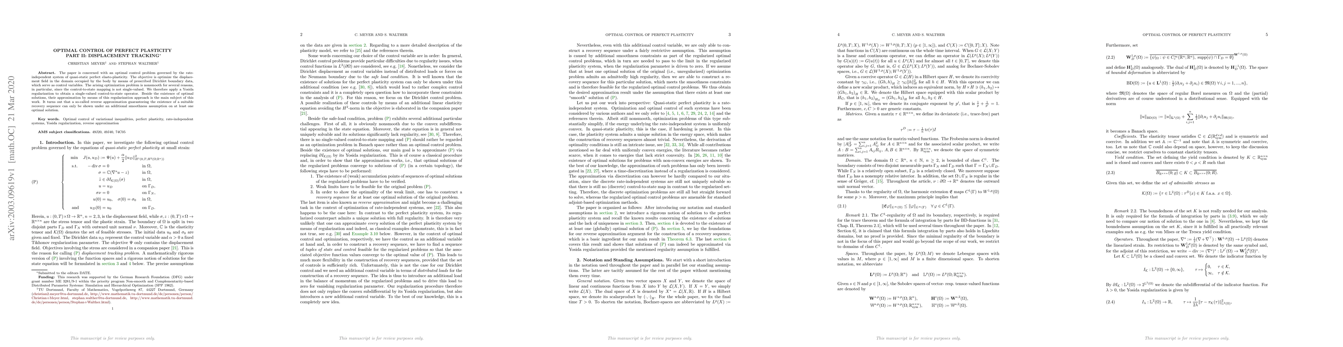 This paper addresses an optimal control problem in quasi-static perfect elasto-plasticity, focusing on optimizing the displacement field via prescribed Dirichlet boundary data. It employs Yosida regularization to handle the nonsmooth nature of the control-to-state mapping, and investigates the approximation of optimal solutions under additional smoothness assumptions.