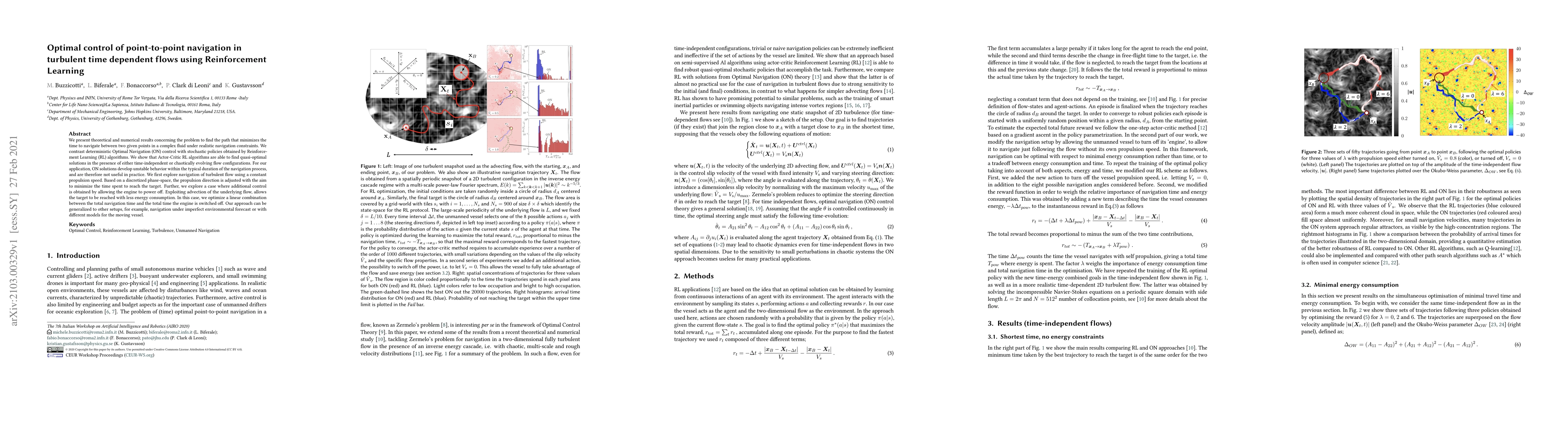 We present theoretical and numerical results concerning the problem to find the path that minimizes the time to navigate between two given points in a complex fluid under realistic navigation constraints. We contrast deterministic Optimal Navigation (ON) control with stochastic policies obtained by Reinforcement Learning (RL) algorithms. We show that Actor-Critic RL algorithms are able to find quasi-optimal solutions in the presence of either time-independent or chaotically evolving flow configurations. For our application, ON solutions develop unstable behavior within the typical duration of the navigation process, and are therefore not useful in practice. We first explore navigation of turbulent flow using a constant propulsion speed. Based on a discretized phase-space, the propulsion direction is adjusted with the aim to minimize the time spent to reach the target. Further, we explore a case where additional control is obtained by allowing the engine to power off. Exploiting advection of the underlying flow, allows the target to be reached with less energy consumption. In this case, we optimize a linear combination between the total navigation time and the total time the engine is switched off. Our approach can be generalized to other setups, for example, navigation under imperfect environmental forecast or with different models for the moving vessel.
