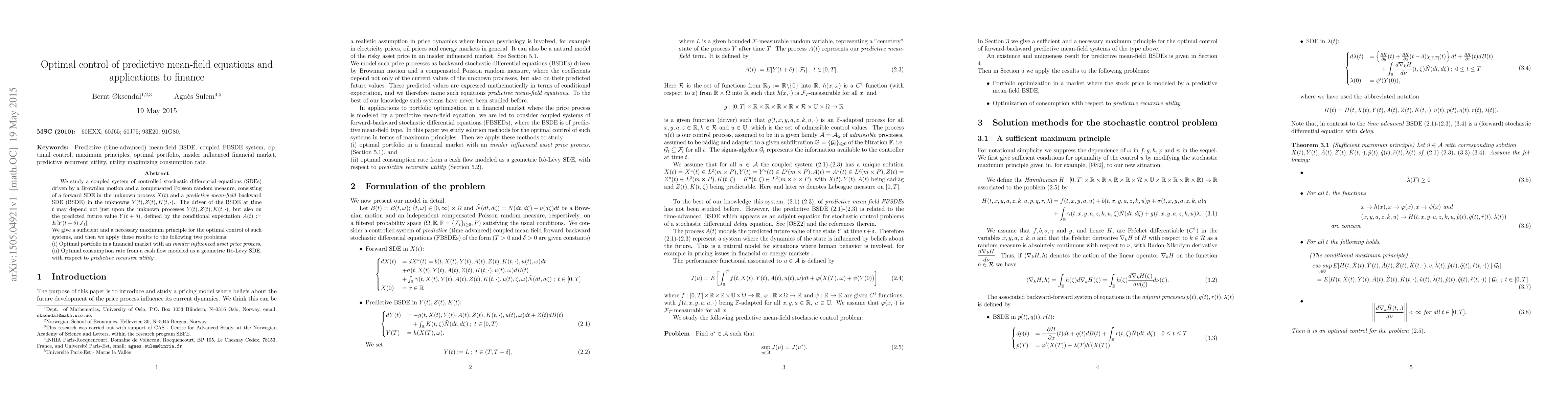 We study a coupled system of controlled stochastic differential equations (SDEs) driven by a Brownian motion and a compensated Poisson random measure, consisting of a forward SDE in the unknown process $X(t)$ and a \emph{predictive mean-field} backward SDE (BSDE) in the unknowns $Y(t), Z(t), K(t,\cdot)$. The driver of the BSDE at time $t$ may depend not just upon the unknown processes $Y(t), Z(t), K(t,\cdot)$, but also on the predicted future value $Y(t+\delta)$, defined by the conditional expectation $A(t):= E[Y(t+\delta) | \mathcal{F}_t]$. \\ We give a sufficient and a necessary maximum principle for the optimal control of such systems, and then we apply these results to the following two problems:\\ (i) Optimal portfolio in a financial market with an \emph{insider influenced asset price process.} \\ (ii) Optimal consumption rate from a cash flow modeled as a geometric It\^ o-L\' evy SDE, with respect to \emph{predictive recursive utility}.