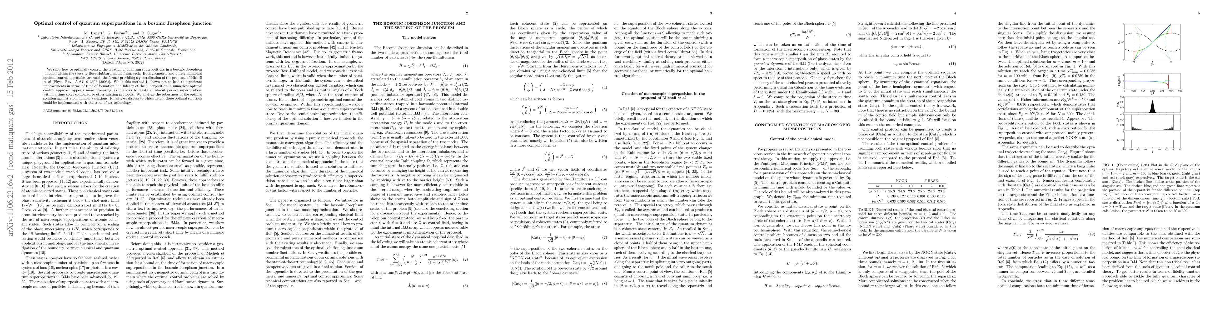 This paper explores optimal control techniques for generating quantum superpositions in a bosonic Josephson junction using the Bose-Hubbard model. While geometric methods show limited improvement, numerical optimal control achieves near-perfect superpositions in shorter times, though robustness and practical implementation remain challenges.