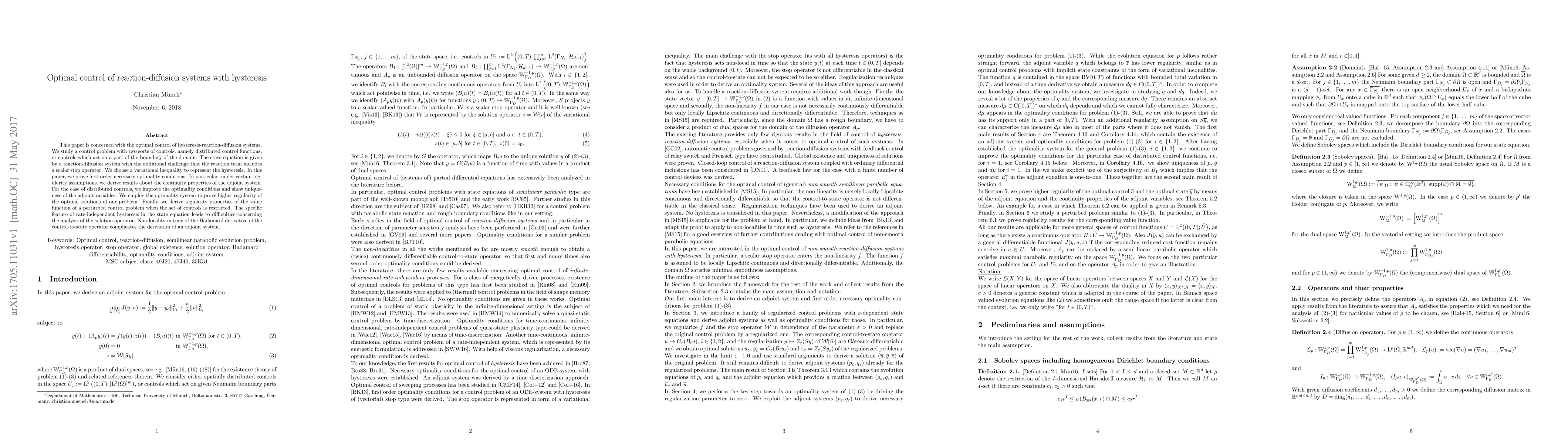 This paper is concerned with the optimal control of hysteresis-reaction-diffusion systems. We study a control problem with two sorts of controls, namely distributed control functions, or controls which act on a part of the boundary of the domain. The state equation is given by a reaction-diffusion system with the additional challenge that the reaction term includes a scalar stop operator. We choose a variational inequality to represent the hysteresis. In this paper, we prove first order necessary optimality conditions. In particular, under certain regularity assumptions, we derive results about the continuity properties of the adjoint system. For the case of distributed controls, we improve the optimality conditions and show uniqueness of the adjoint variables. We employ the optimality system to prove higher regularity of the optimal solutions of our problem. Finally, we derive regularity properties of the value function of a perturbed control problem when the set of controls is restricted. The specific feature of rate-independent hysteresis in the state equation leads to difficulties concerning the analysis of the solution operator. Non-locality in time of the Hadamard derivative of the control-to-state operator complicates the derivation of an adjoint system.