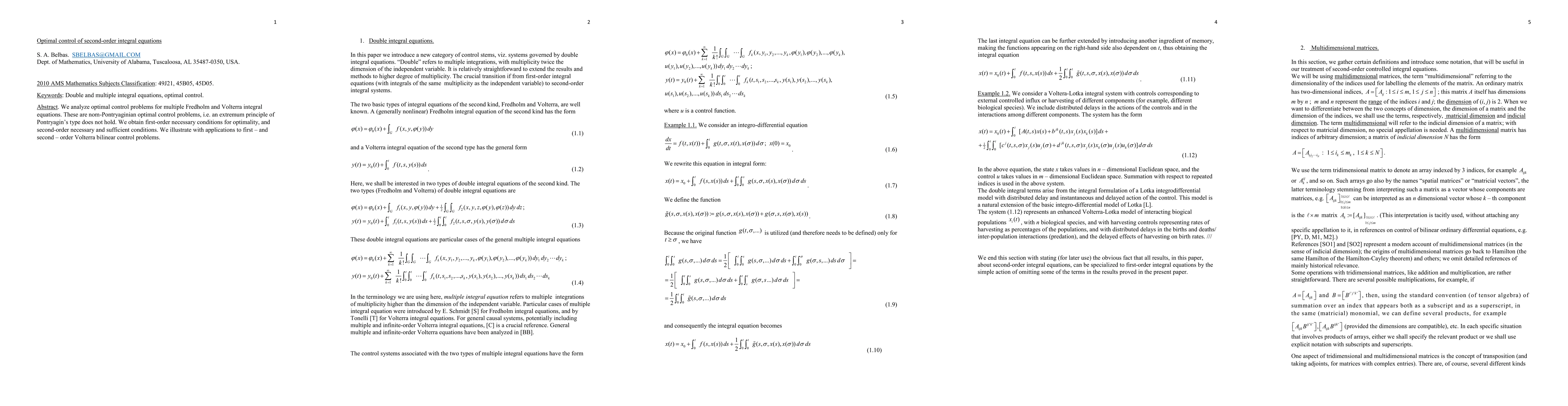We analyze optimal control problems for multiple Fredholm and Volterra integral equations. These are non Pontryaginian optimal control problems, i.e. an extremum principle of Pontryagin type does not hold. We obtain first order necessary conditions for optimality, and second order necessary and sufficient conditions. We illustrate with applications to first order and second order Volterra bilinear control problems.