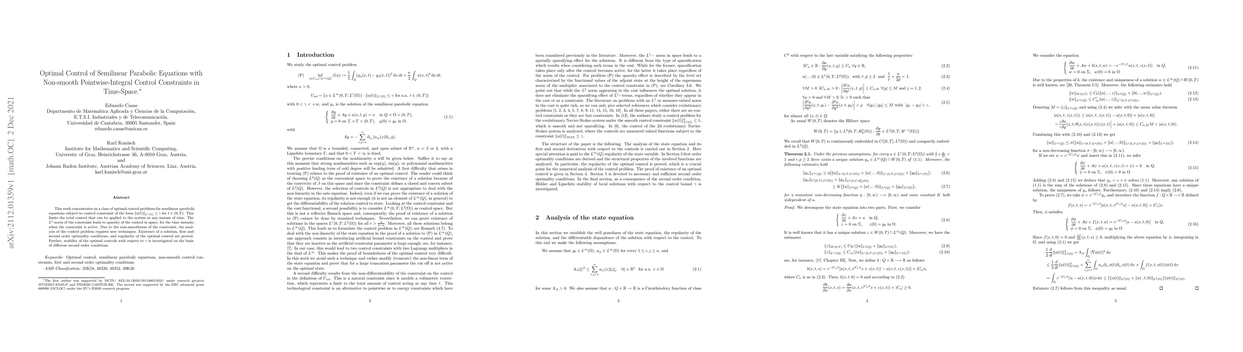 This paper studies optimal control of semilinear parabolic equations under non-smooth pointwise-integral control constraints. It proves existence, optimality conditions, and stability of the optimal control, addressing the challenges posed by the non-smoothness of the $L^1$-norm constraint.