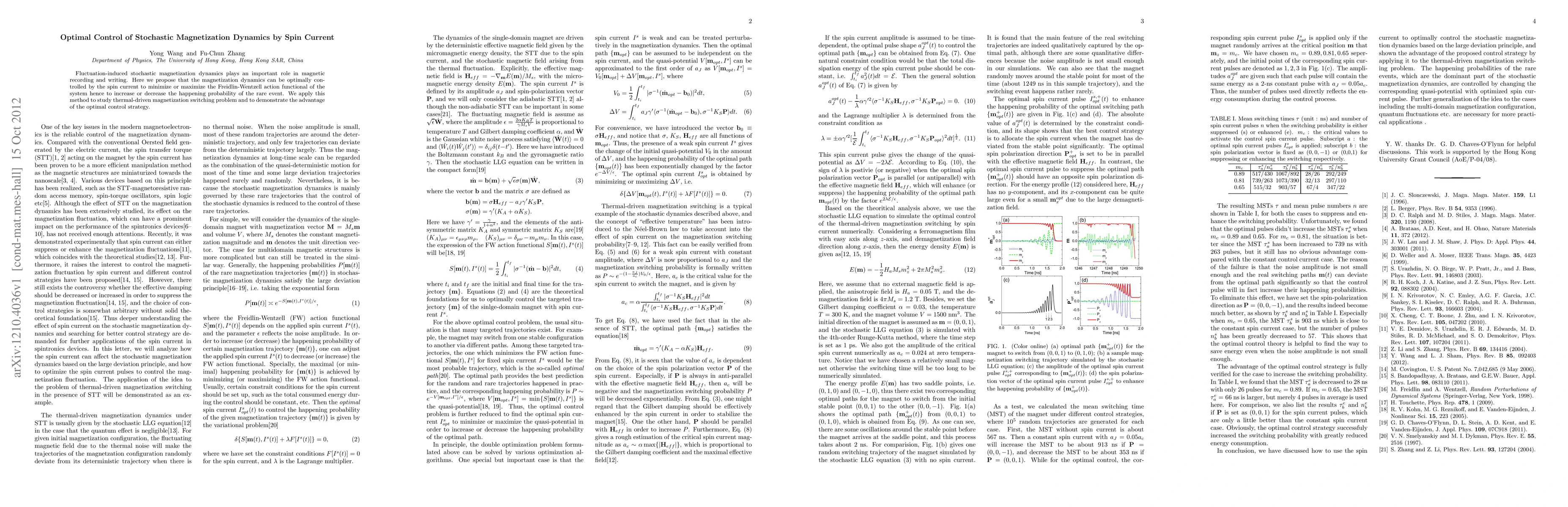 This paper proposes an optimal control method using spin current to manipulate stochastic magnetization dynamics, aiming to minimize or maximize the Freidlin-Wentzell action functional, thereby controlling the probability of rare events. The method is demonstrated through thermal-driven magnetization switching, showcasing its effectiveness in magnetic recording and writing.