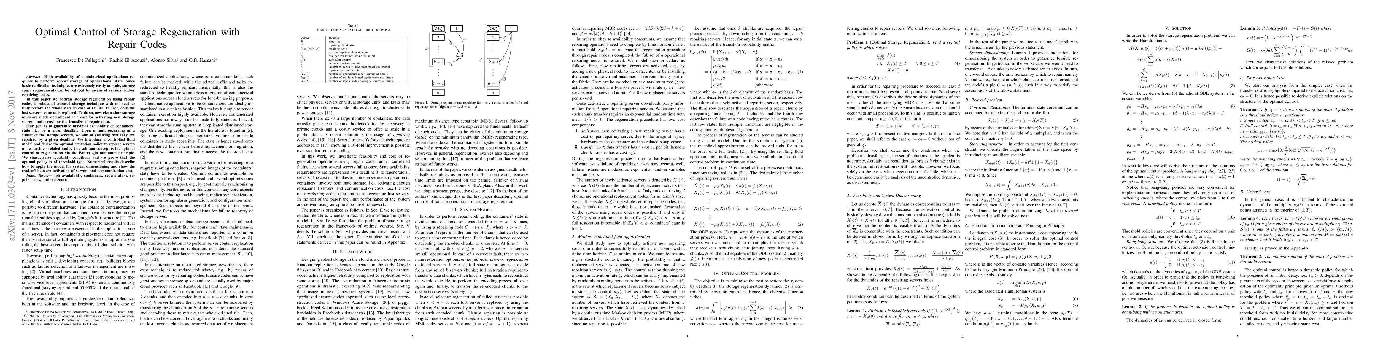 The paper introduces a controlled fluid model and derives the optimal activation policy for storage regeneration using repair codes, applying the Pontryagin minimum principle for optimal control.