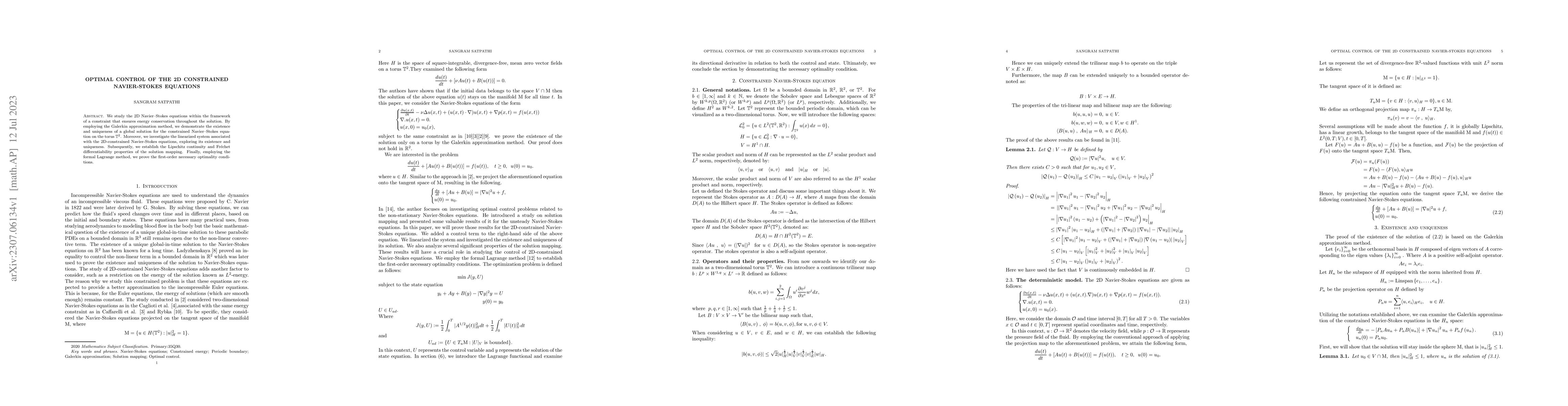 This paper investigates the 2D constrained Navier-Stokes equations with an energy conservation constraint, proving the existence and uniqueness of a global solution using the Galerkin method. It also establishes the Lipschitz continuity and Fréchet differentiability of the solution mapping and proves first-order necessary optimality conditions via the formal Lagrange method.