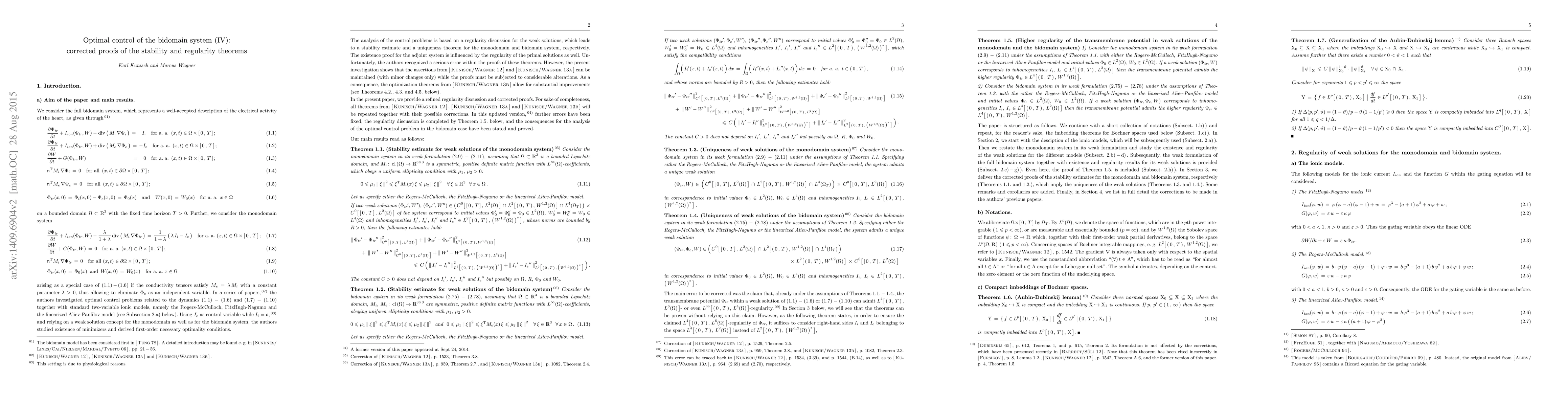 This paper corrects errors in previous proofs for stability and regularity theorems of the bidomain system in cardiac electrophysiology, maintaining the original assertions with minor changes and improving optimization theorems.