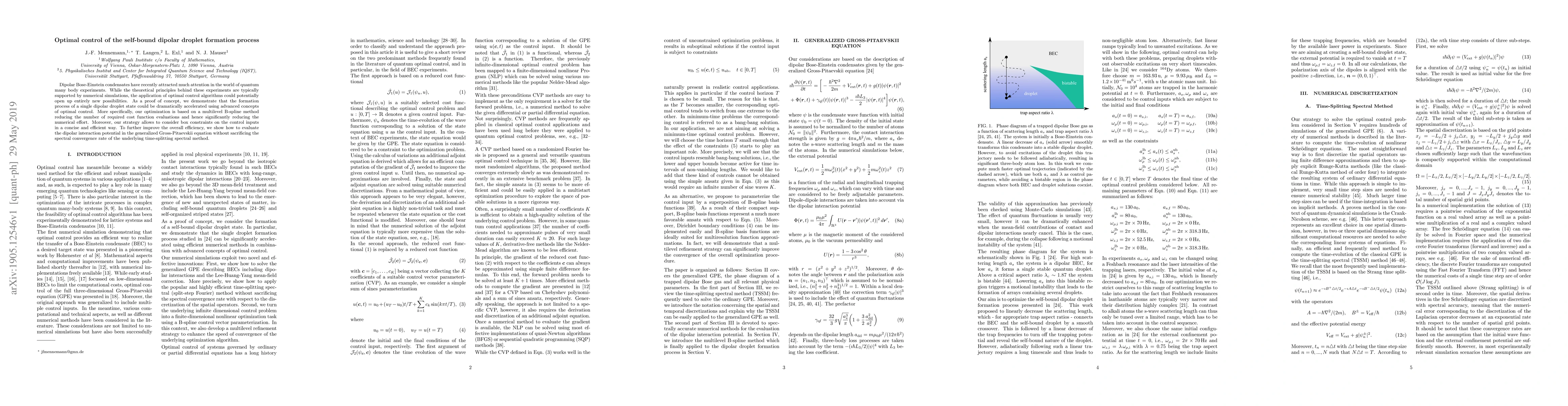 Dipolar Bose-Einstein condensates have recently attracted much attention in the world of quantum many body experiments. While the theoretical principles behind these experiments are typically supported by numerical simulations, the application of optimal control algorithms could potentially open up entirely new possibilities. As a proof of concept, we demonstrate that the formation process of a single dipolar droplet state could be dramatically accelerated using advanced concepts of optimal control. More specifically, our optimization is based on a multilevel B-spline method reducing the number of required cost function evaluations and hence significantly reducing the numerical effort. Moreover, our strategy allows to consider box constraints on the control inputs in a concise and efficient way. To further improve the overall efficiency, we show how to evaluate the dipolar interaction potential in the generalized Gross-Pitaevskii equation without sacrificing the spectral convergence rate of the underlying time-splitting spectral method.