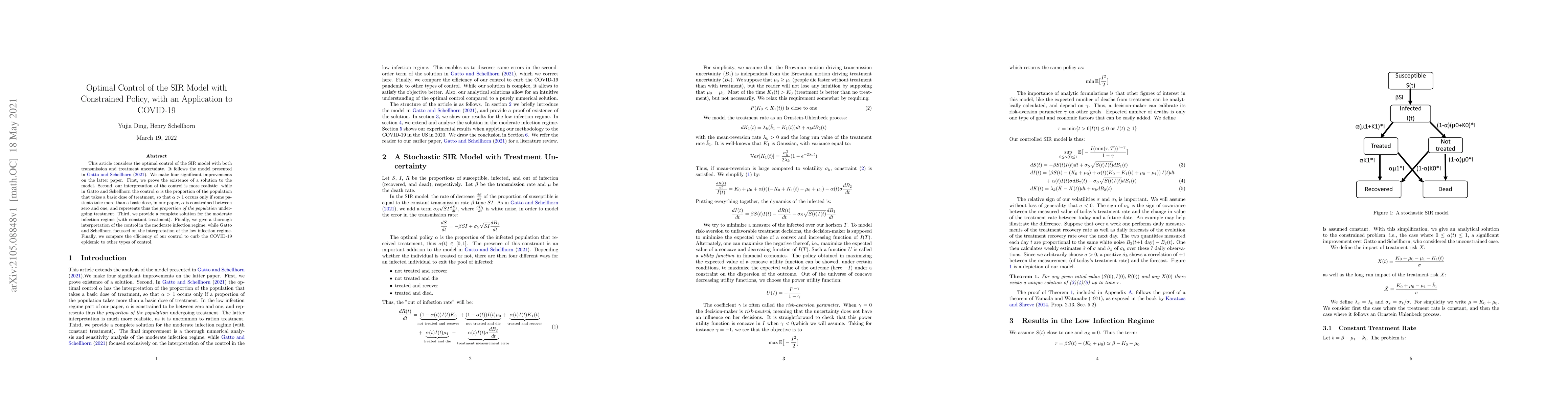 This article considers the optimal control of the SIR model with both transmission and treatment uncertainty. It follows the model presented in Gatto and Schellhorn (2021). We make four significant improvements on the latter paper. First, we prove the existence of a solution to the model. Second, our interpretation of the control is more realistic: while in Gatto and Schellhorn the control $\alpha$ is the proportion of the population that takes a basic dose of treatment, so that $\alpha >1$ occurs only if some patients take more than a basic dose, in our paper, $\alpha$ is constrained between zero and one, and represents thus the proportion of the population undergoing treatment. Third, we provide a complete solution for the moderate infection regime (with constant treatment). Finally, we give a thorough interpretation of the control in the moderate infection regime, while Gatto and Schellhorn focussed on the interpretation of the low infection regime. Finally, we compare the efficiency of our control to curb the COVID-19 epidemic to other types of control.