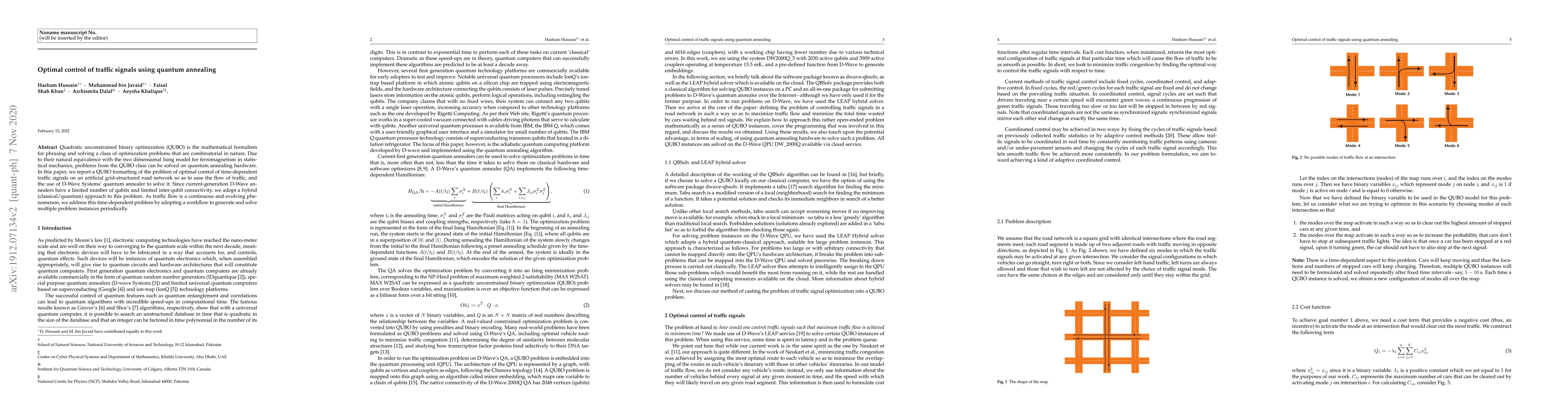 Quadratic unconstrained binary optimization (QUBO) is the mathematical formalism for phrasing and solving a class of optimization problems that are combinatorial in nature. Due to their natural equivalence with the two dimensional Ising model for ferromagnetism in statistical mechanics, problems from the QUBO class can be solved on quantum annealing hardware. In this paper, we report a QUBO formatting of the problem of optimal control of time-dependent traffic signals on an artificial grid-structured road network so as to ease the flow of traffic, and the use of D-Wave Systems' quantum annealer to solve it. Since current-generation D-Wave annealers have a limited number of qubits and limited inter-qubit connectivity, we adopt a hybrid (classical/quantum) approach to this problem. As traffic flow is a continuous and evolving phenomenon, we address this time-dependent problem by adopting a workflow to generate and solve multiple problem instances periodically.